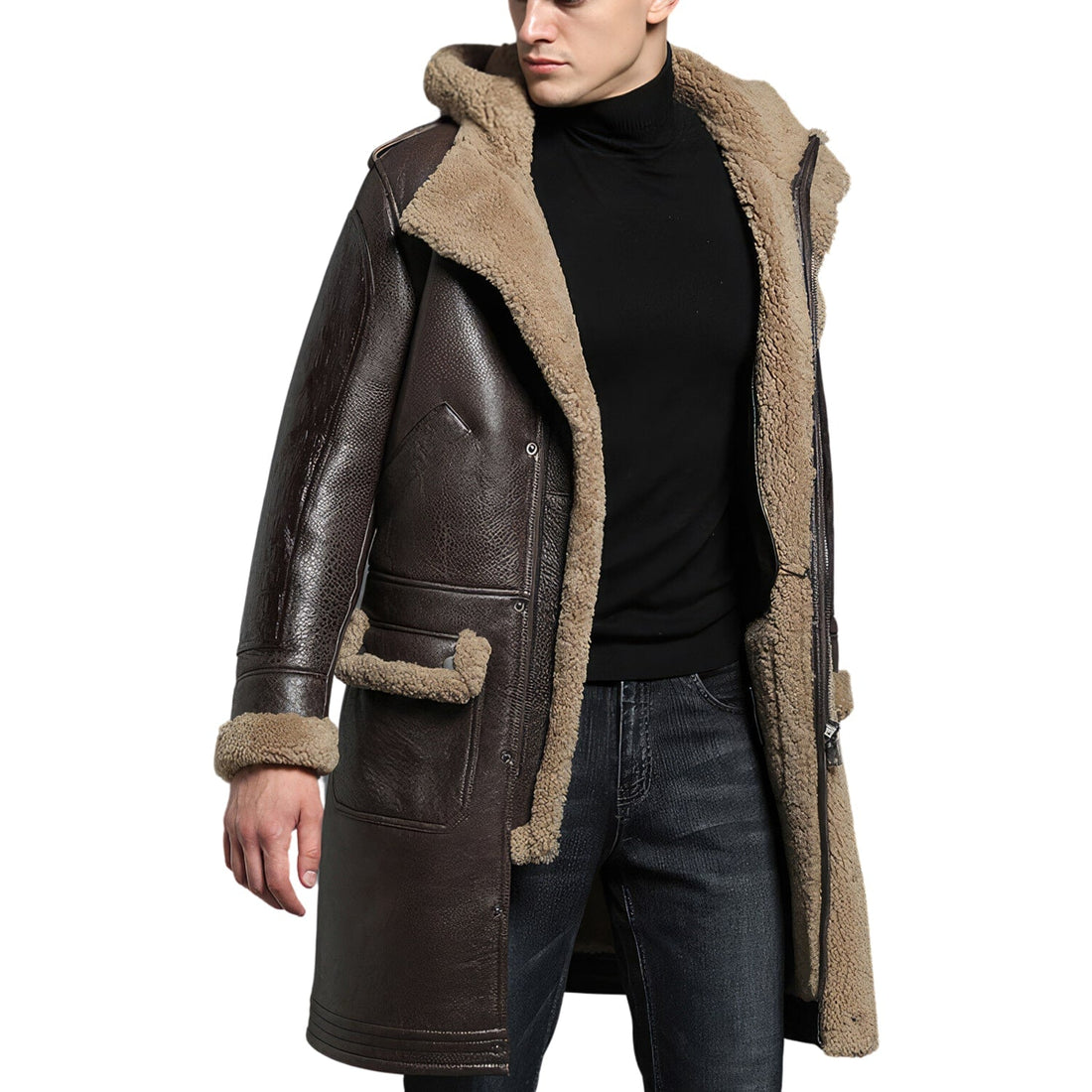 Men’s Brown Genuine Sheepskin Sherpa Shearling Faux Fur Lines Hooded Winter Warm Thick Retro Uniform Military Leather Coat