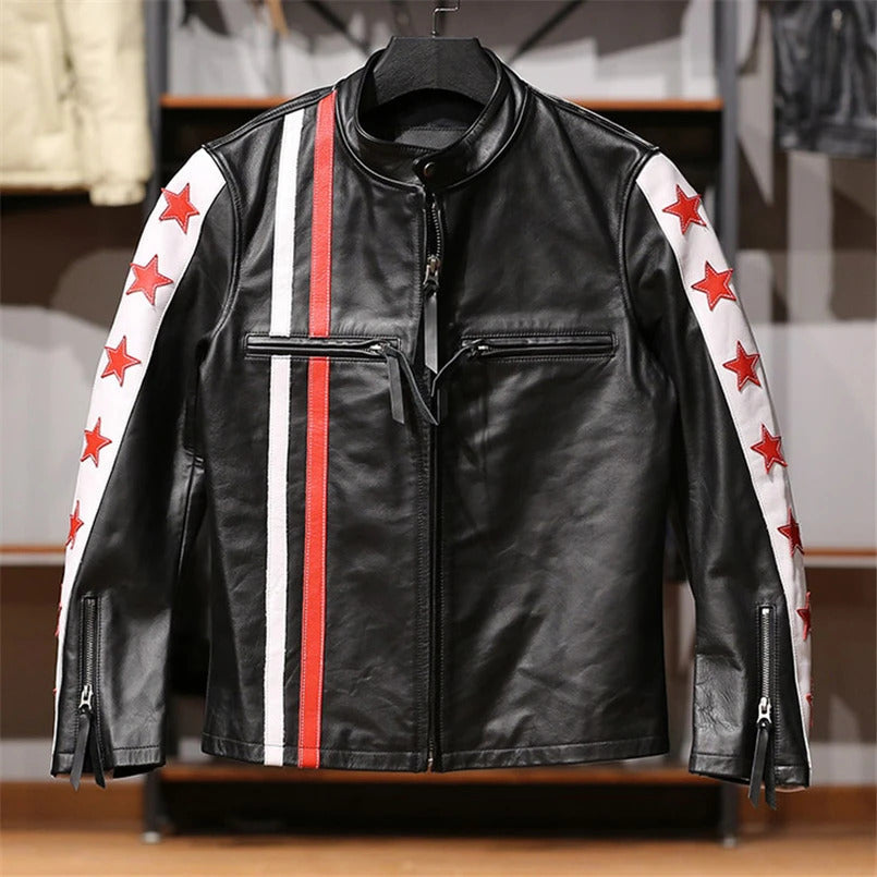 Men's Knight J100 Genuine Leather Jacket with Stand Collar & Red Stripe