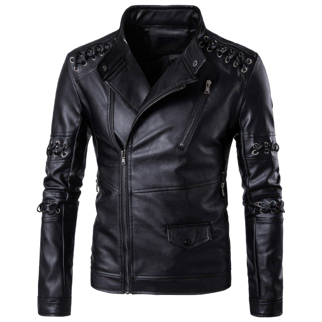 Men’s Black Biker Genuine Sheepskin Laces Café Racer Outfit Asymmetric Crossover Zip-Up Retro Casual Classic Rider Leather Jacket