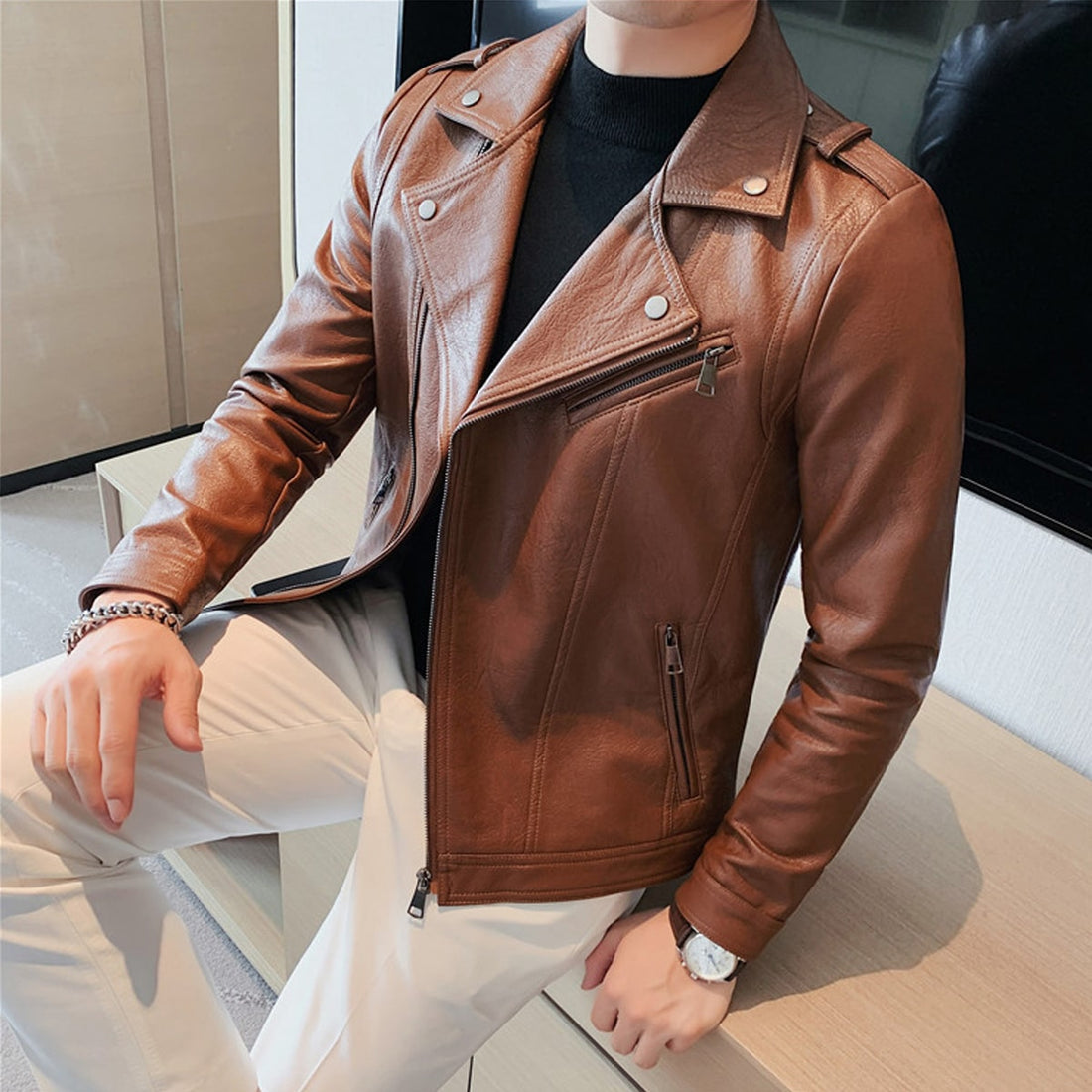 Men’s Brown Moto Biker Genuine Sheepskin Lapel Collar Asymmetric Rider Motorcycle Fashion Leather Jacket