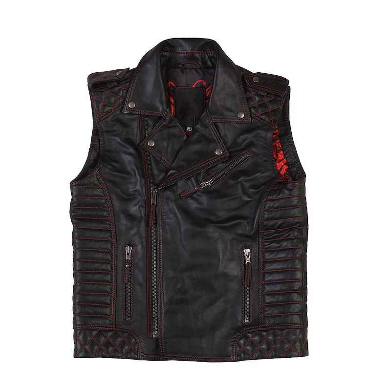 Men's Stylish Lambskin Leather Vest - Fully Quilted with Red Stitching