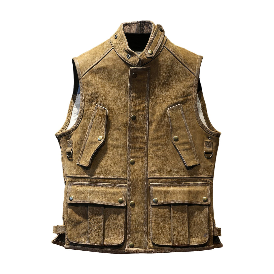 Men’s Brown Genuine Cowhide Stand Collar Vest Motorcycle Biker Sleeveless Classic Retro Rock Hunter Multi Pockets Leather Waistcoat