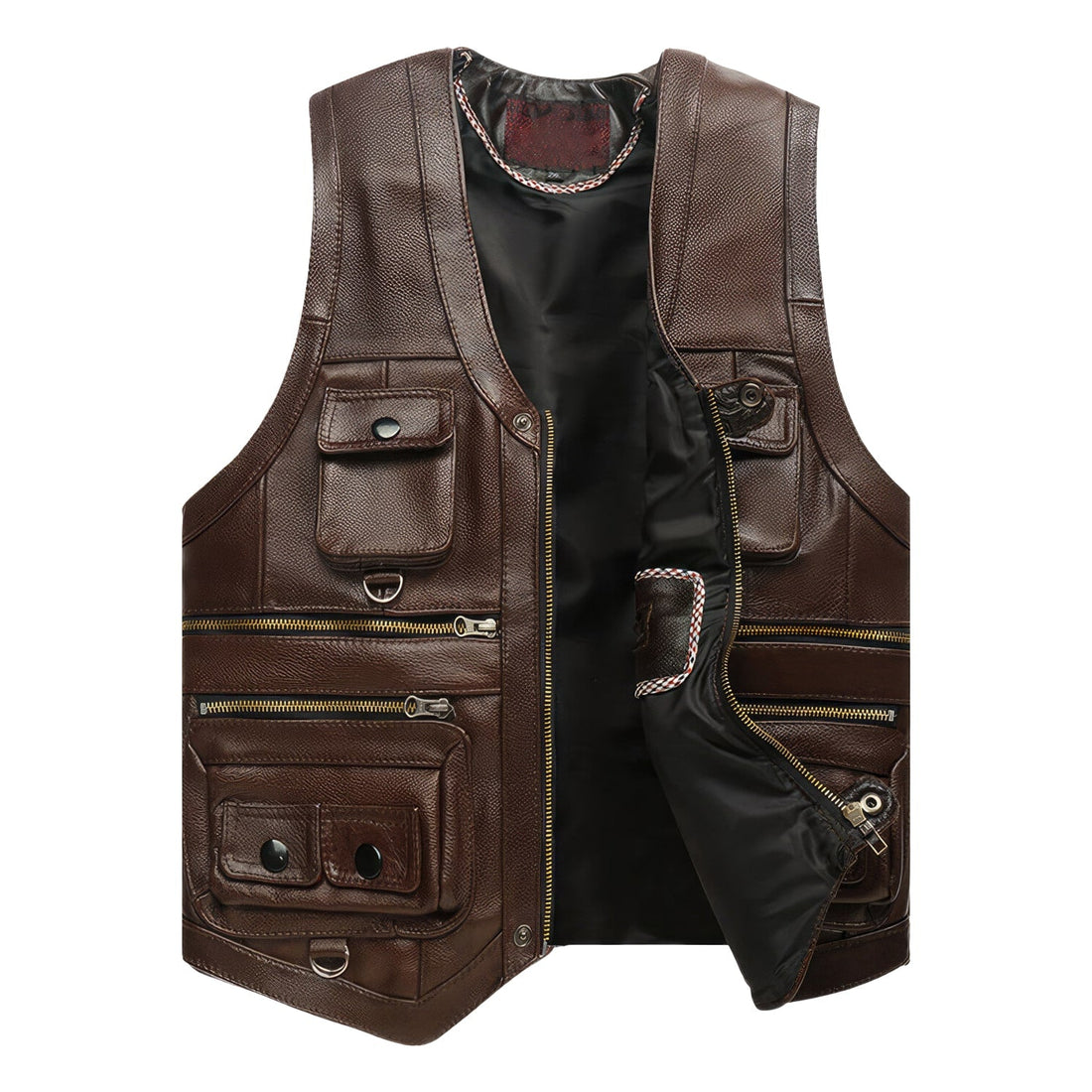 Men’s Brown Biker Genuine Cowhide V-Neck Cafe Racer Vest Multi Pockets Motorcycle Sporty Racer Leather Waistcoat