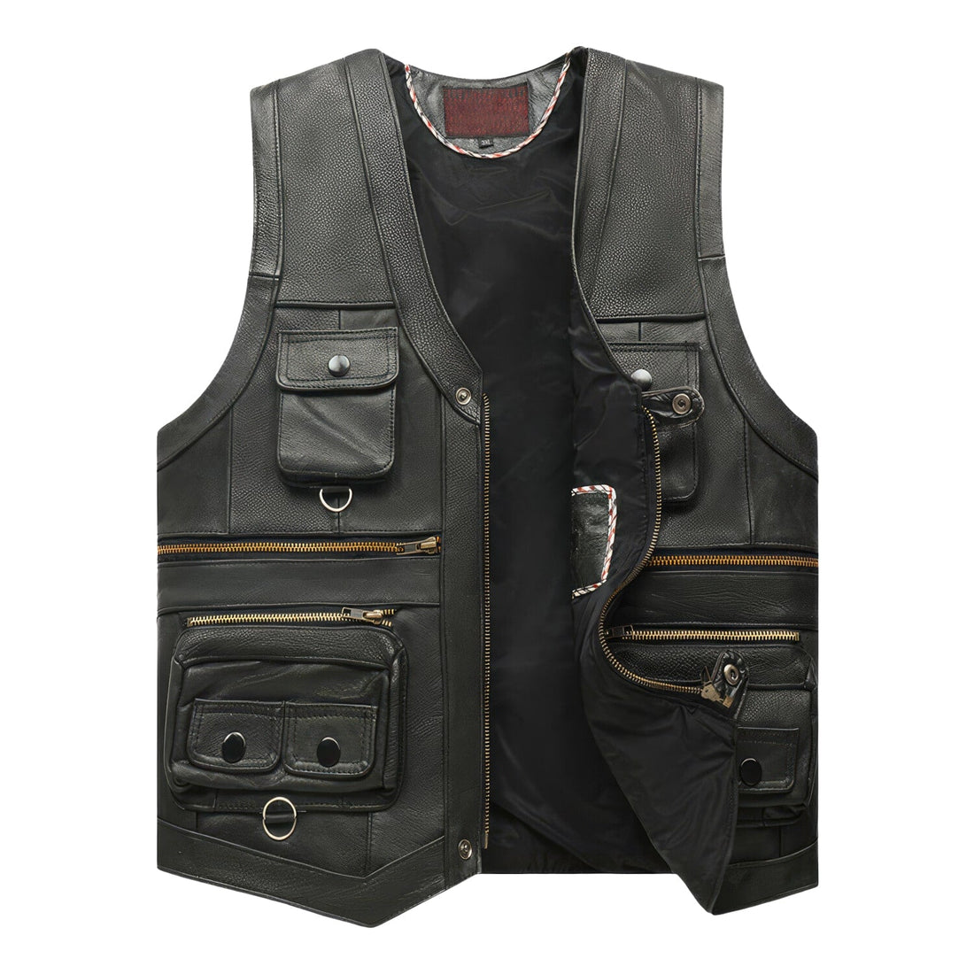 Men’s Black Biker Genuine Cowhide V-Neck Cafe Racer Vest Multi Pockets Motorcycle Sporty Racer Leather Waistcoat
