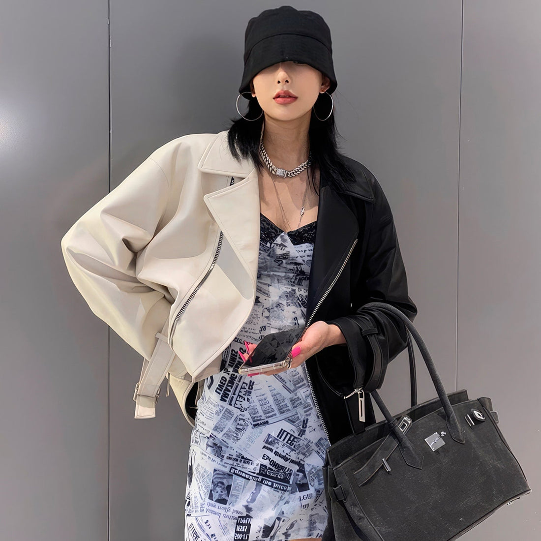 Women’s Black & Beige Genuine Sheepskin Lapel Collar Moto Biker Casual Classic Loose Oversized Café Racer Asymmetric Leather Jacket