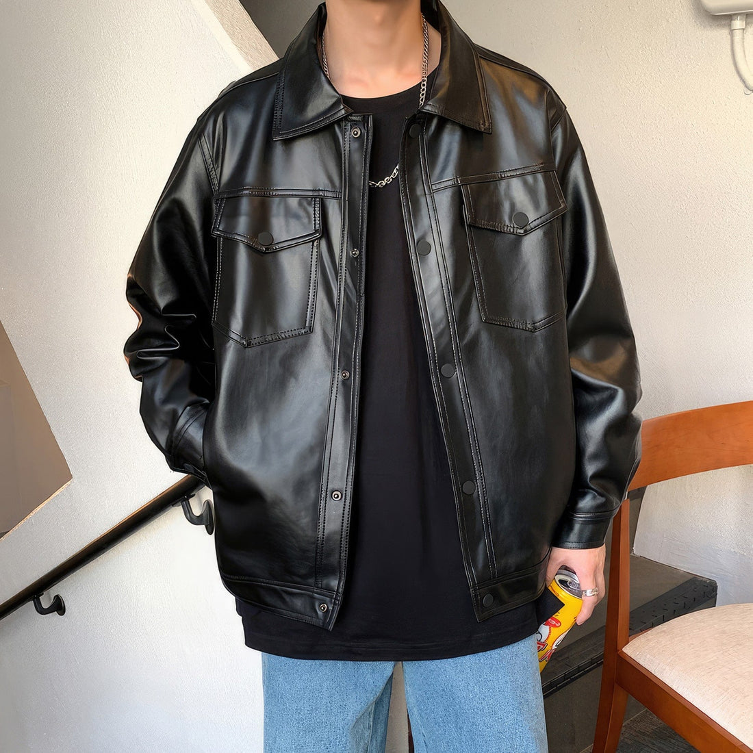 : Men’s Black Genuine Sheepskin Shirt Collar Oversized Street Style Casual Spring Loose Fashion Leather Jacket