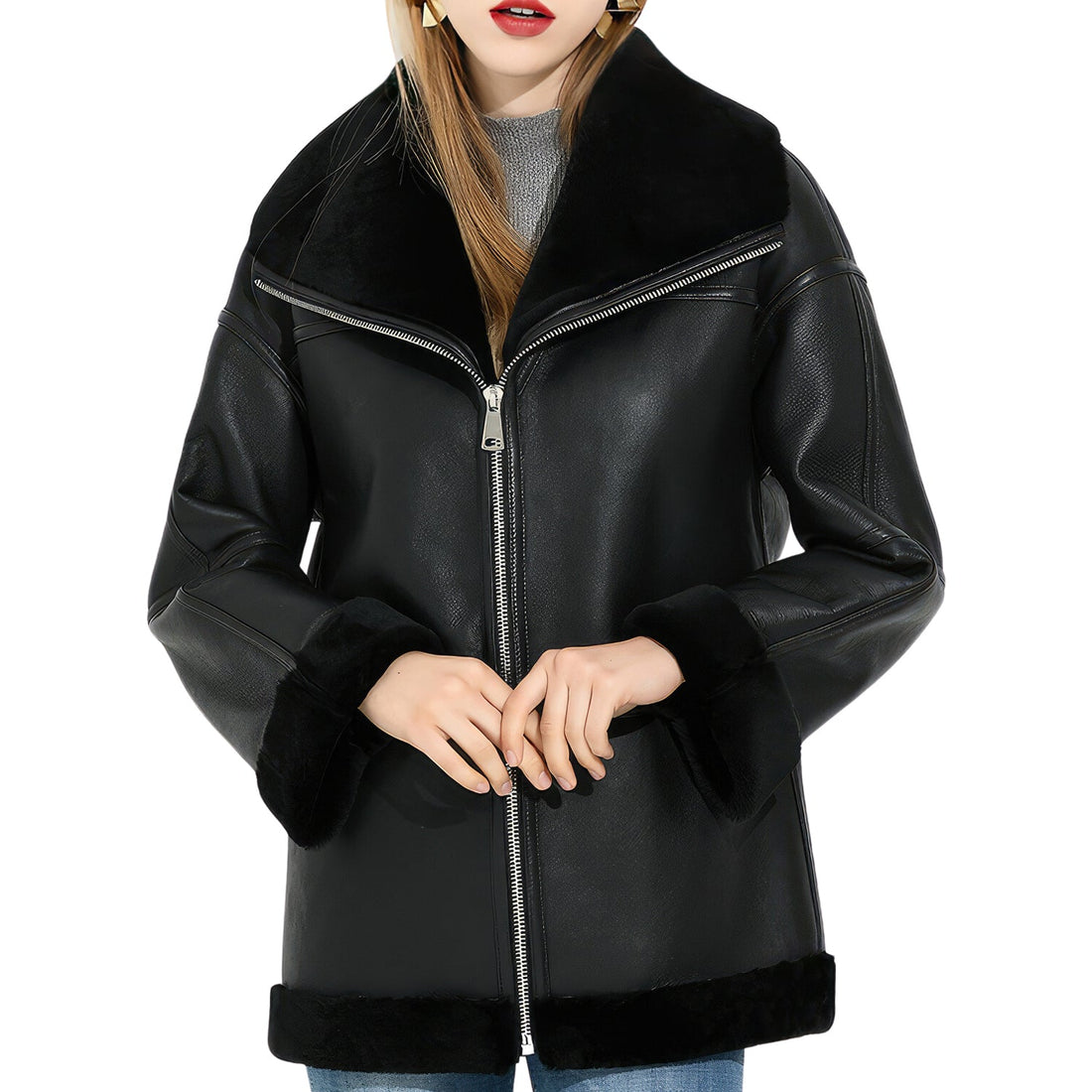 Women’s Black Genuine Sheepskin Sherpa Shearling Faux Fur Lined Winter Warm Eco-Fur Fashionable Aviator Pilot Leather Jacket