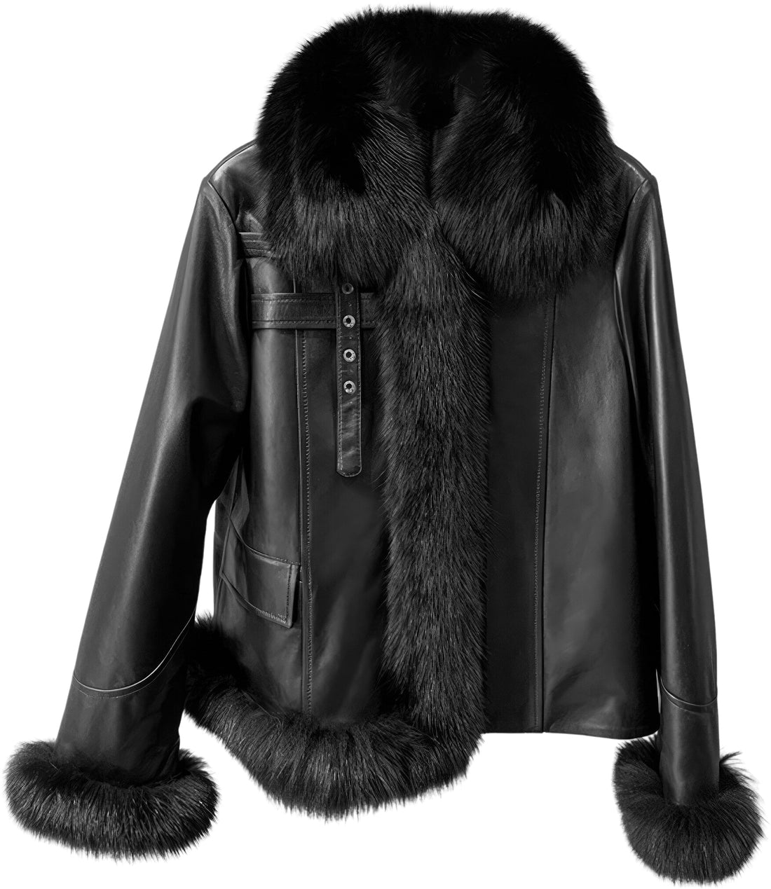 Women’s Black Genuine Sheepskin Sherpa Shearling Faux Fur Cuffs Fashionable Casual Classic Winter Warm Slim Fit Leather Jacket