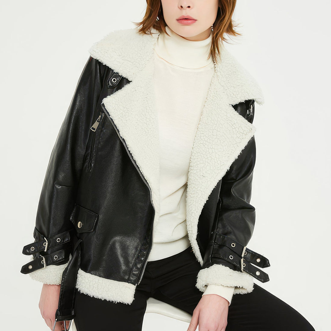 Women’s White Genuine Sheepskin Sherpa Shearling Faux Fur Lined Casual Fashion Thick Oversized Waist Drawstring Leather Jacket