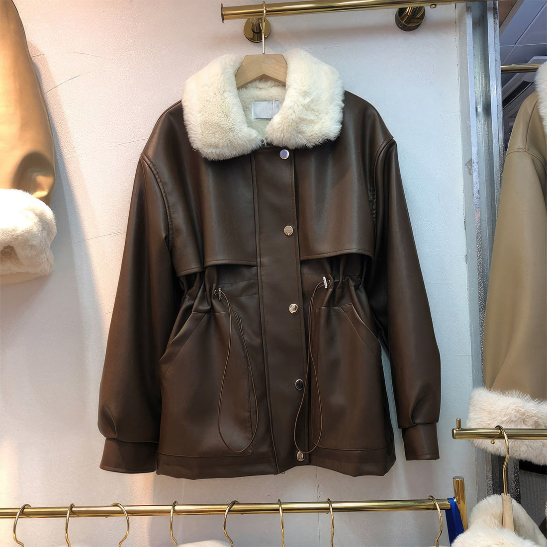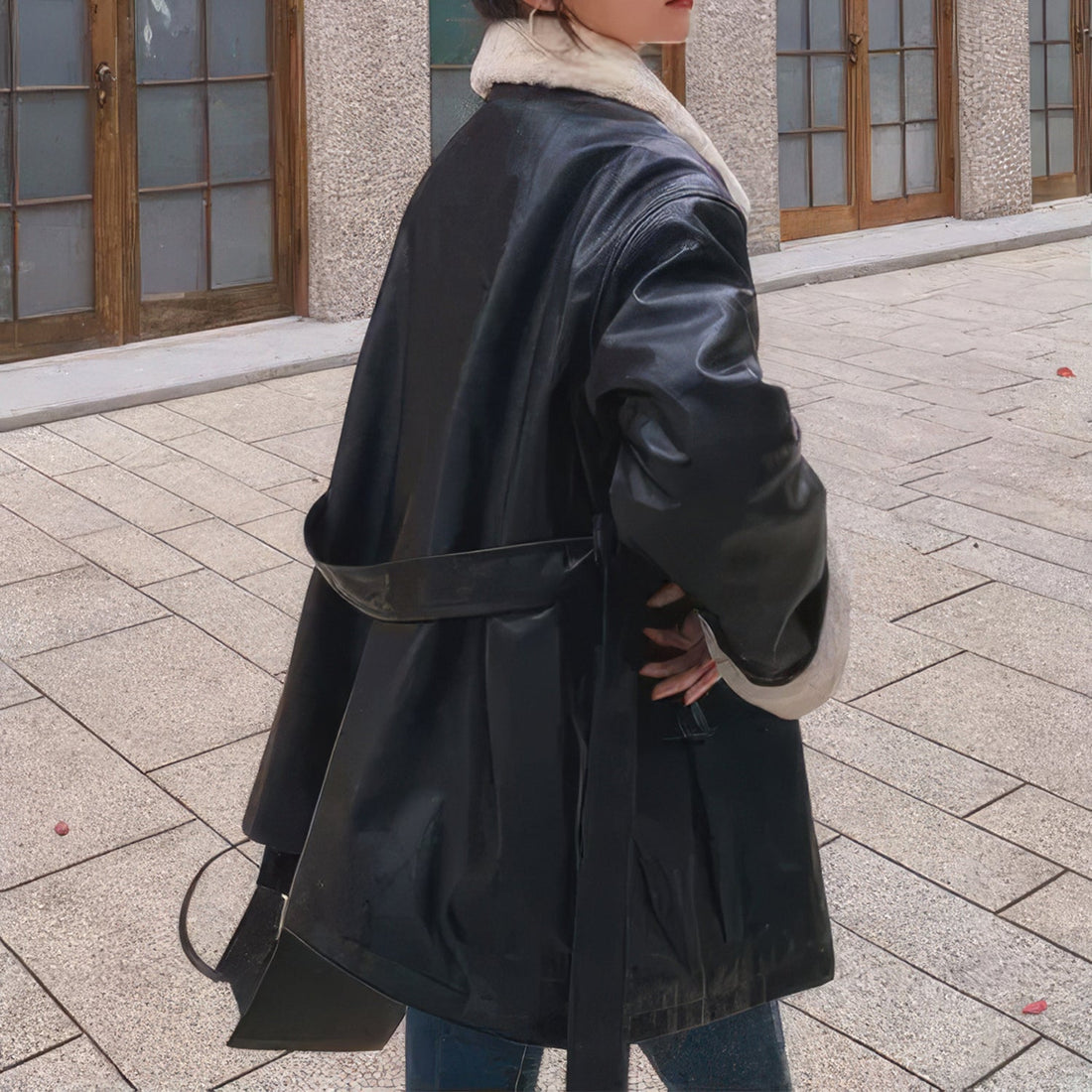 Women’s Auburn Genuine Sheepskin Sherpa Shearling Faux Fur Lined Casual Fashion Thick Oversized Waist Drawstring Leather Jacket