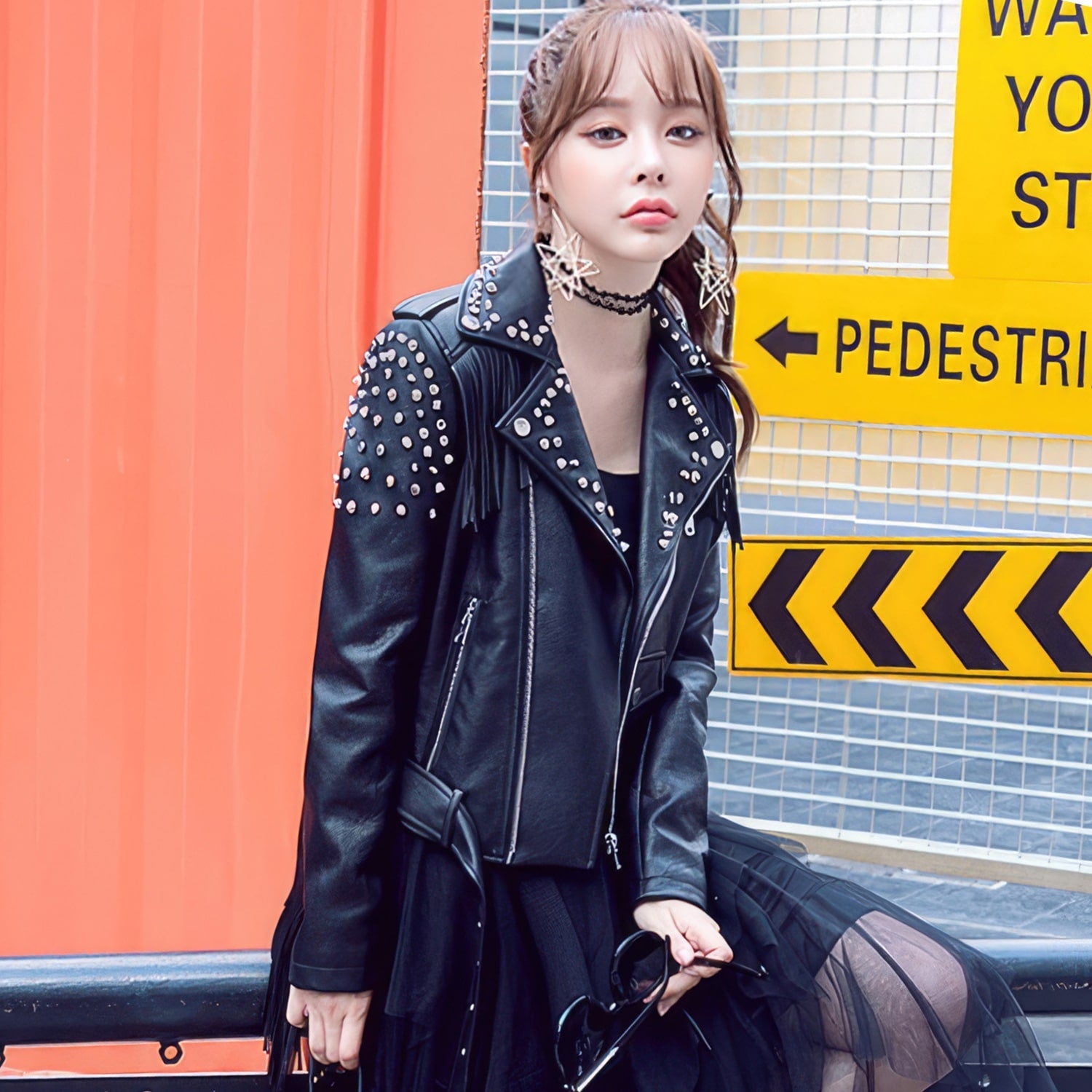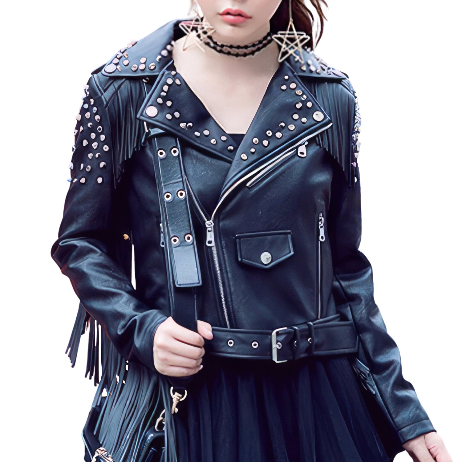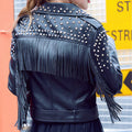 Classic Streetwear: Women's Black Biker Leather Jacket with Genuine Sheepskin, Tassels, Beaded Details, and Asymmetric Fringe