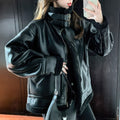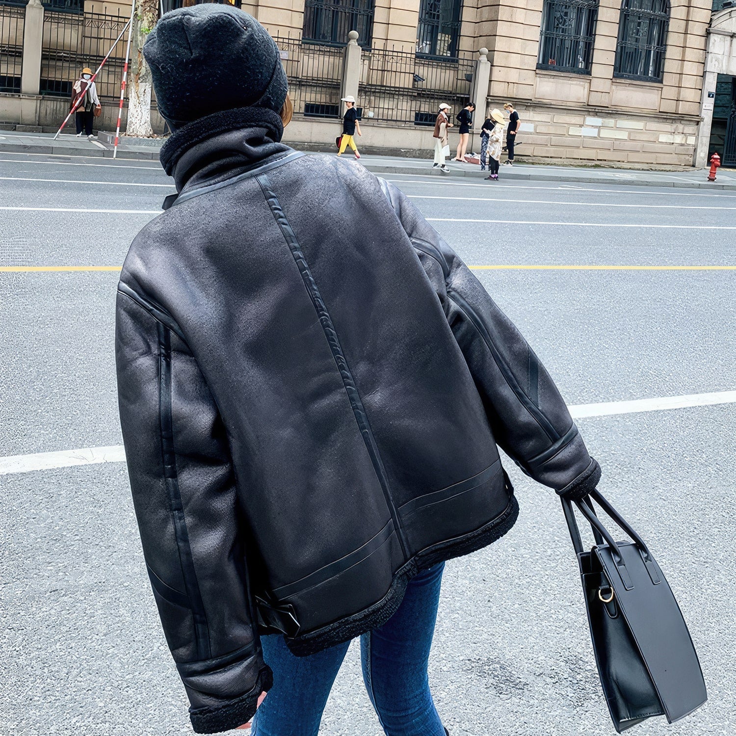 Women’s Black Aviator Genuine Sheepskin Sherpa Shearling Faux Fur Lined Thick Winter Warm Streetwear Chic Flight Pilot Leather Jacket