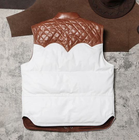 Unique Design: Stand out with the distinctive California Bear Leather Vest Down Jacket featuring striking brown and white contrast.