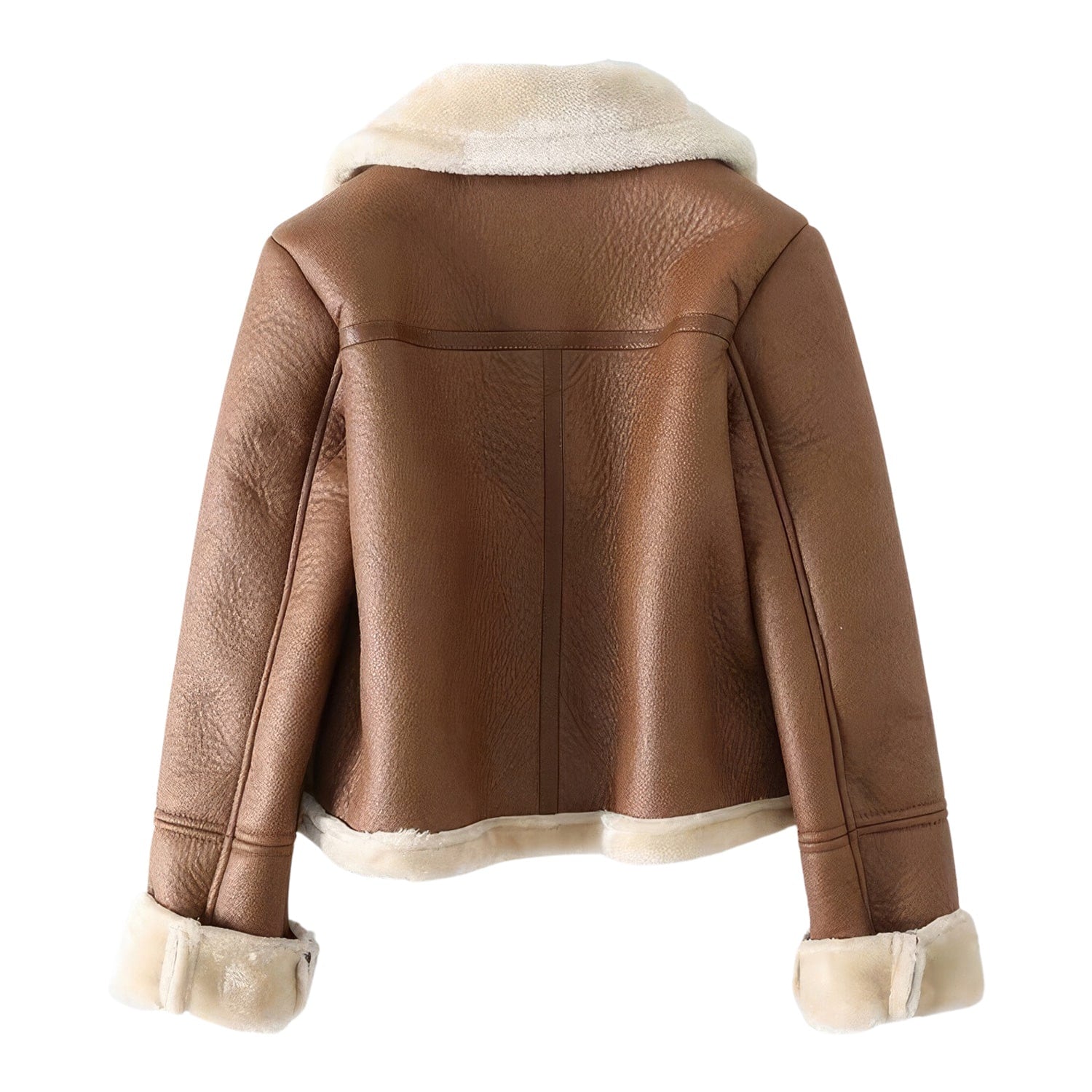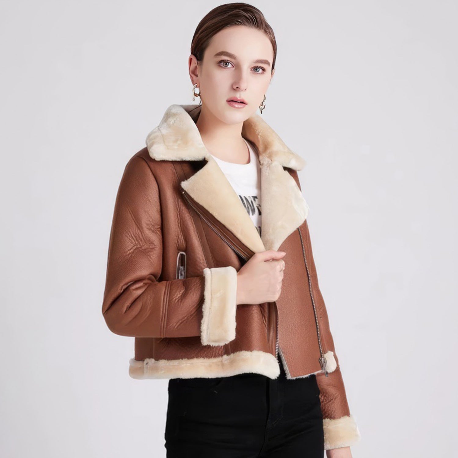 Brown Aviator Genuine Sheepskin Sherpa Shearling Faux Fur Women's Winter Warm Bomber Flight Pilot Leather Jacket