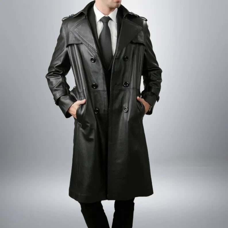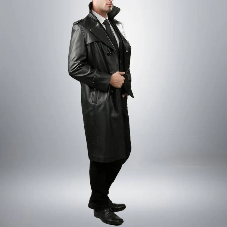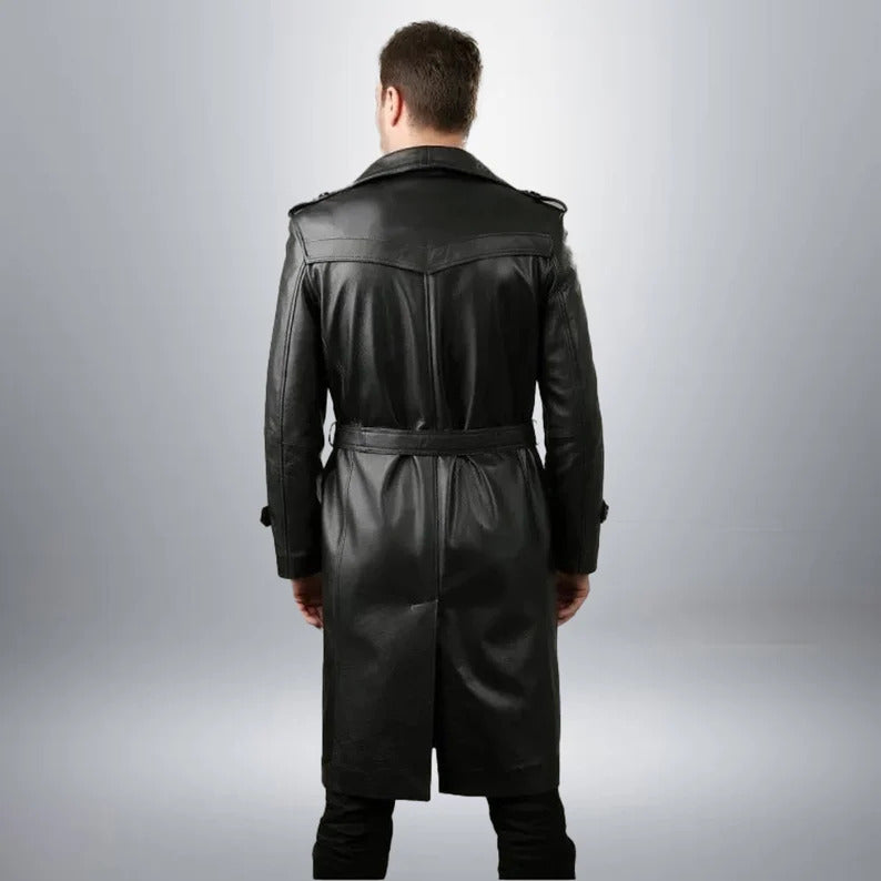 Handmade Full-Length Black Sheepskin Leather Trench Coat