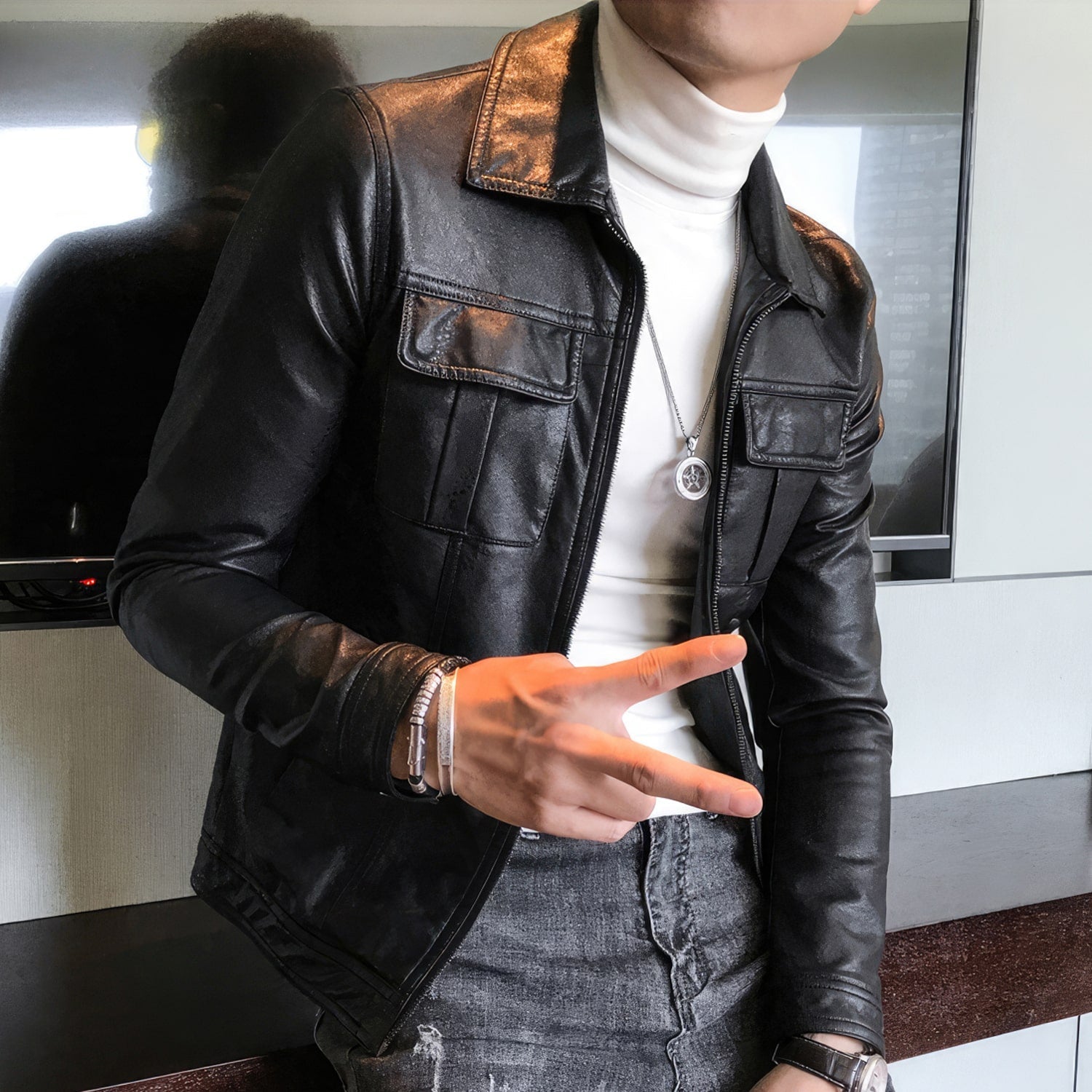 Step into timeless style with the Men’s Black Biker Genuine Sheepskin Shirt Collar Leather Jacket. Crafted from genuine sheepskin, this jacket ensures durability and a luxury feel. The shirt collar adds a dash of casual chic, while the YKK one-way zipper ensures secure fastening. For practicality, the jacket comes with utility pockets on the chest to keep your essentials close at hand. Drawing on Café Racer aesthetics, this piece blends retro charm with modern edge, promising a smooth ride in terms of both style and comfort.