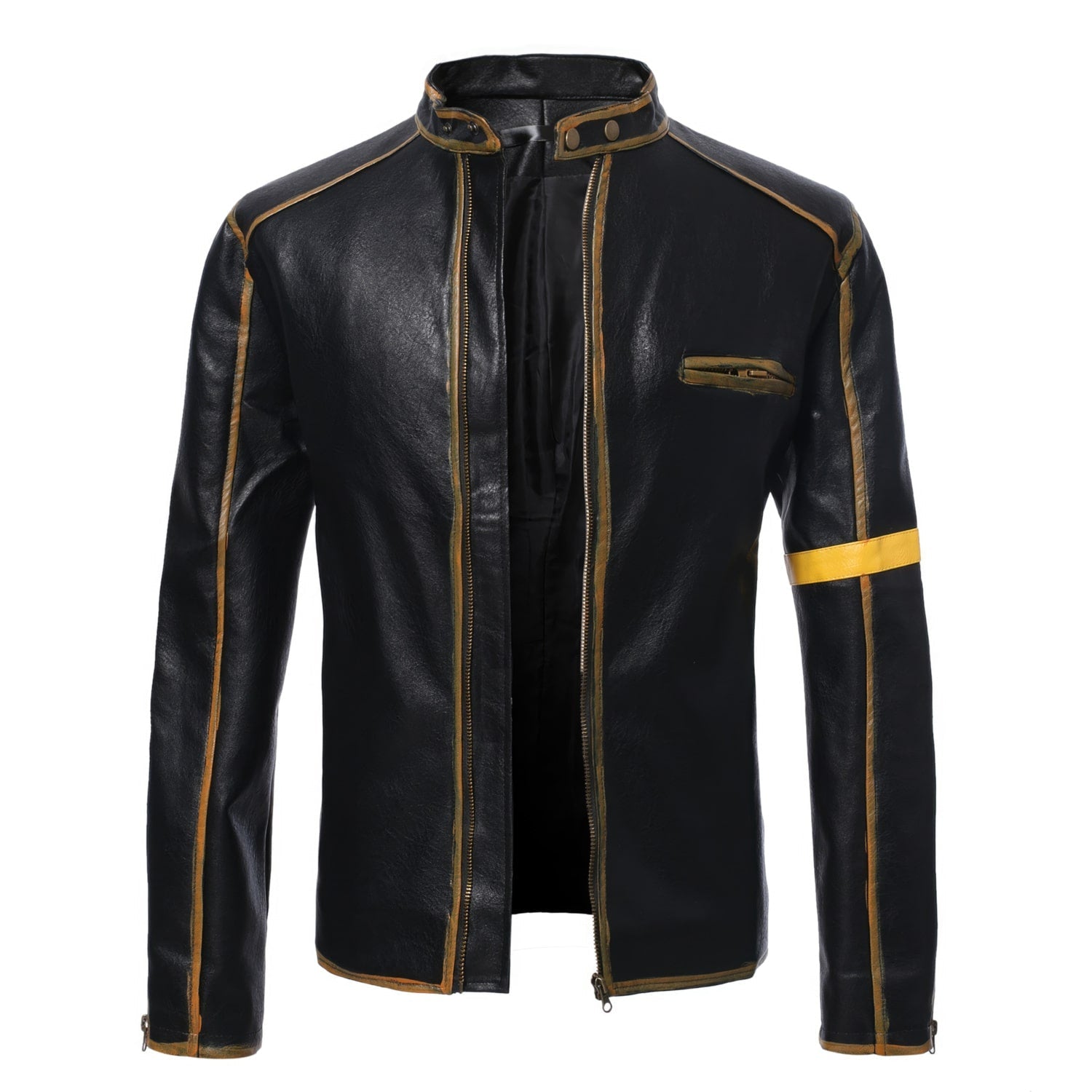 Make a bold style statement with our Men’s Black Biker Genuine Sheepskin Leather Jacket. With its stand collar and golden vintage lines, this piece adds a dash of retro charm to your ensemble. Crafted from genuine sheepskin leather, the jacket offers not only a rich, luxurious feel but also durability for long-lasting use. The jacket features a reliable YKK one-way zipper closure, ensuring a secure and comfortable fit. Perfect for casual outings or a café racer look, this vintage leather jacket is a must-have for those who value style and quality in their wardrobe. Stand out from the crowd and make this unique piece yours today.