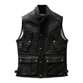 Men’s Black Genuine Cowhide Stand Collar Vest Motorcycle Biker Sleeveless Classic Retro Rock Hunter Multi Pockets Leather Waistcoat