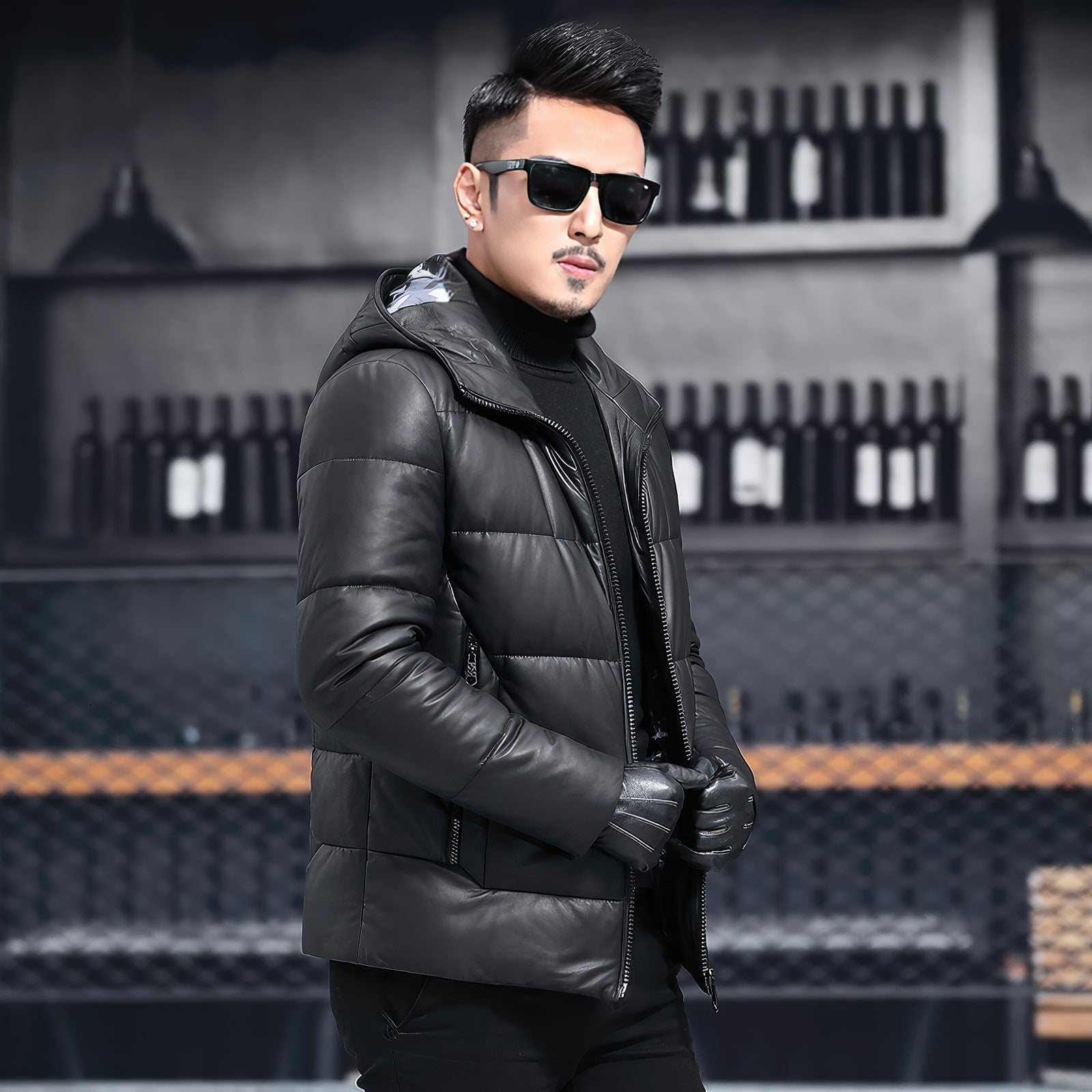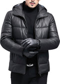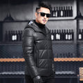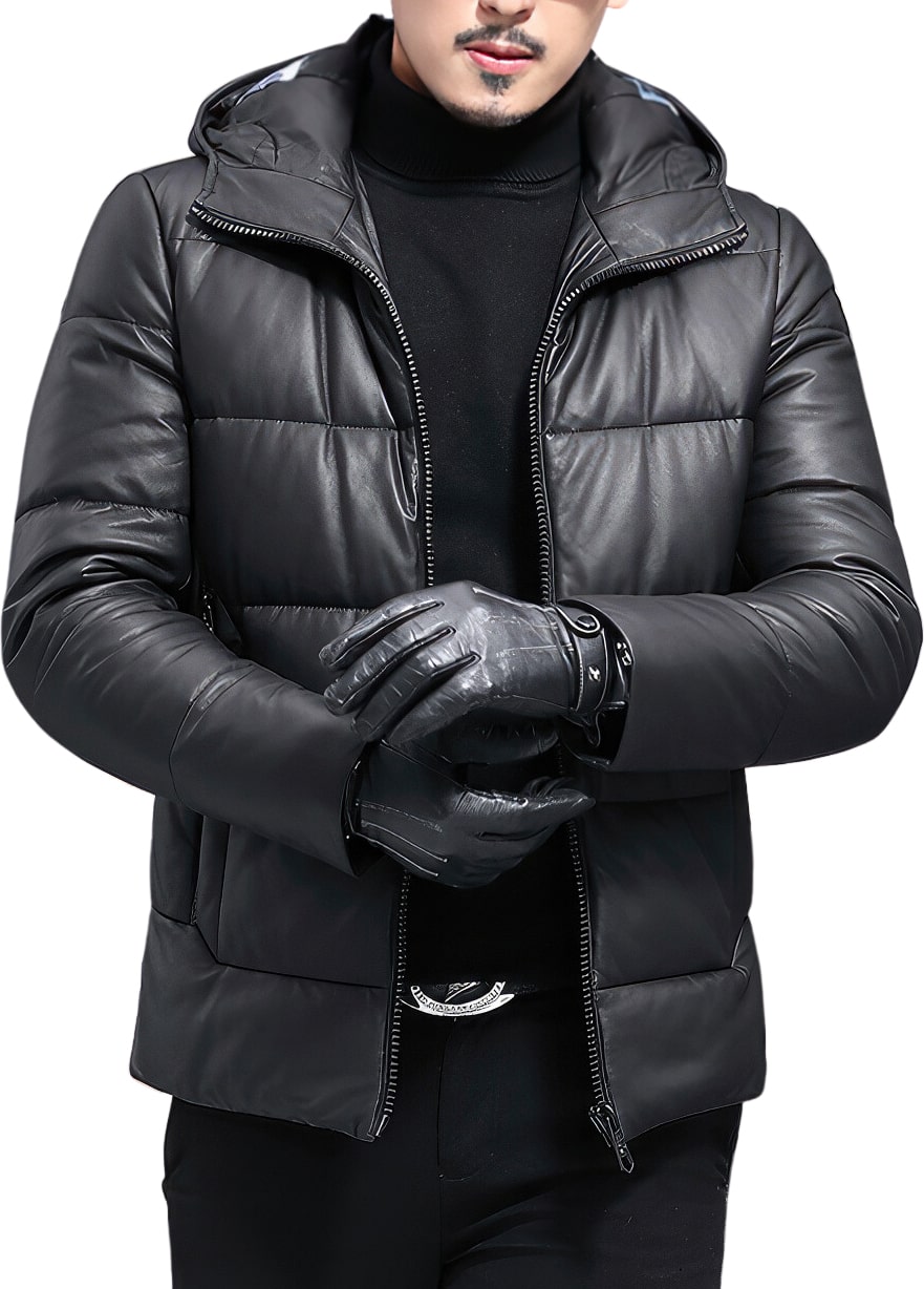 Men’s Black Genuine Sheepskin Hooded Winter Warm Thick Casual Baggy Padded Puffer Lightweight Insulated Parka Leather Jacket