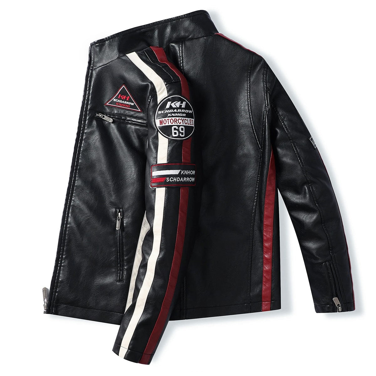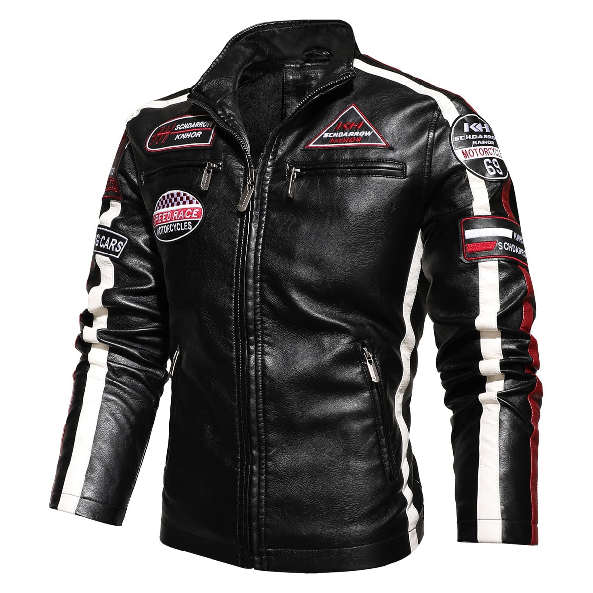 Men’s Black Rider Genuine Sheepskin Stand Collar Cool Embroidery Patch Aviator Fashionable Casual Motorcycle Biker Leather Jacket
