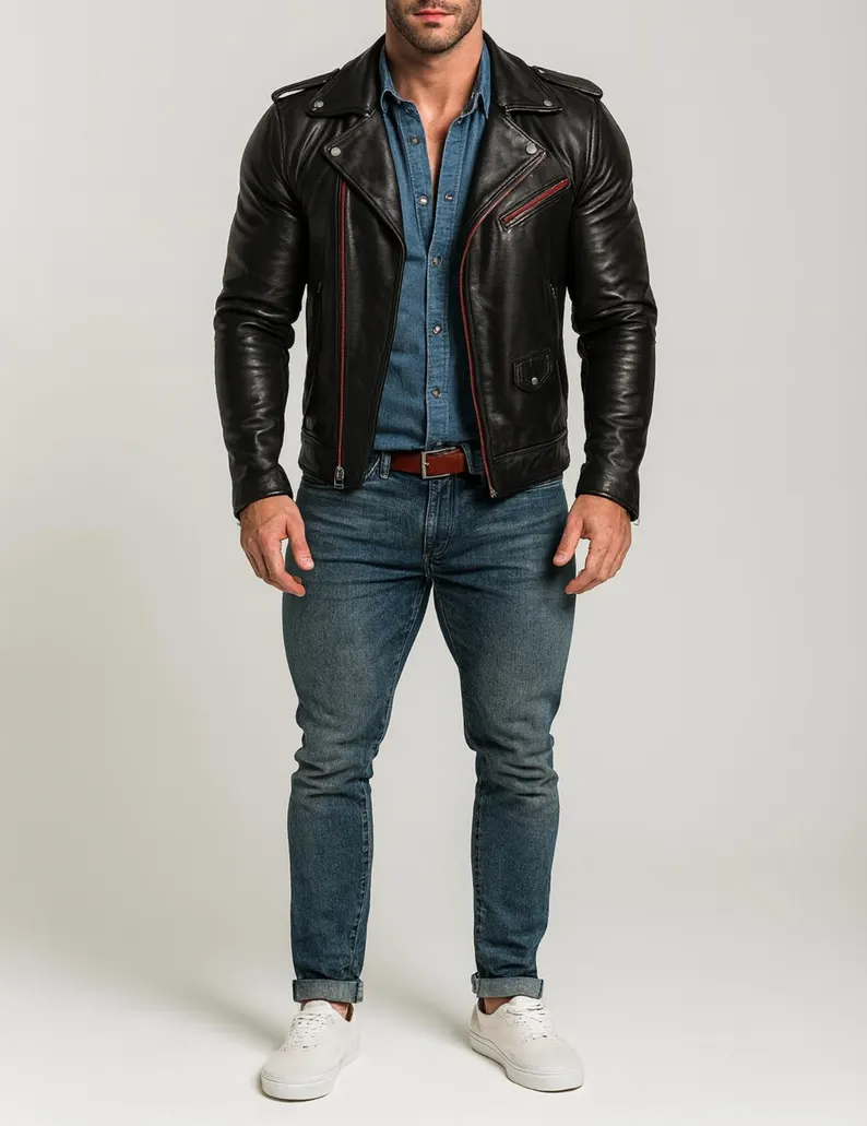 Men’s Black Sheep Leather Biker Jacket – Modern Fit with Red Zipper Accents