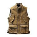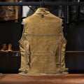 Men’s Brown Genuine Cowhide Stand Collar Vest Motorcycle Biker Sleeveless Classic Retro Rock Hunter Multi Pockets Leather Waistcoat