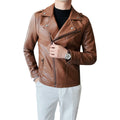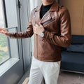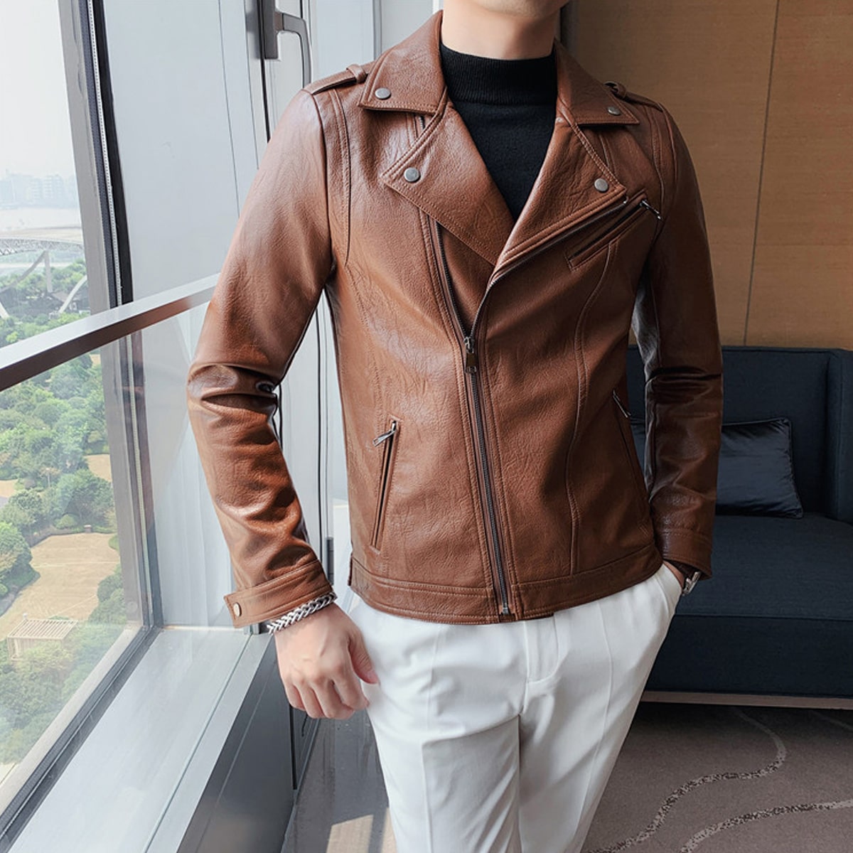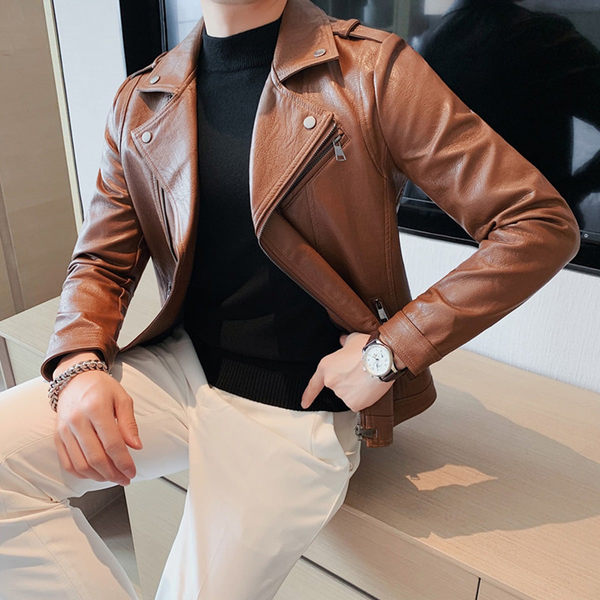 Men’s Brown Moto Biker Genuine Sheepskin Lapel Collar Asymmetric Rider Motorcycle Fashion Leather Jacket
