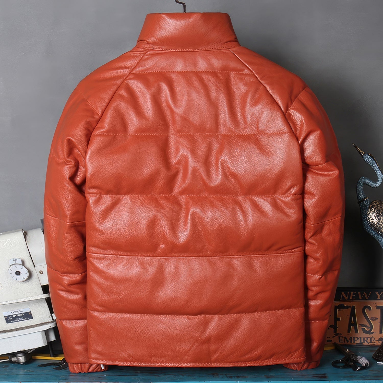 Men’s Rust Genuine Sheepskin High Neck Padded Thick Winter Warm Casual Baggy Sporty Puffer Leather Jacket