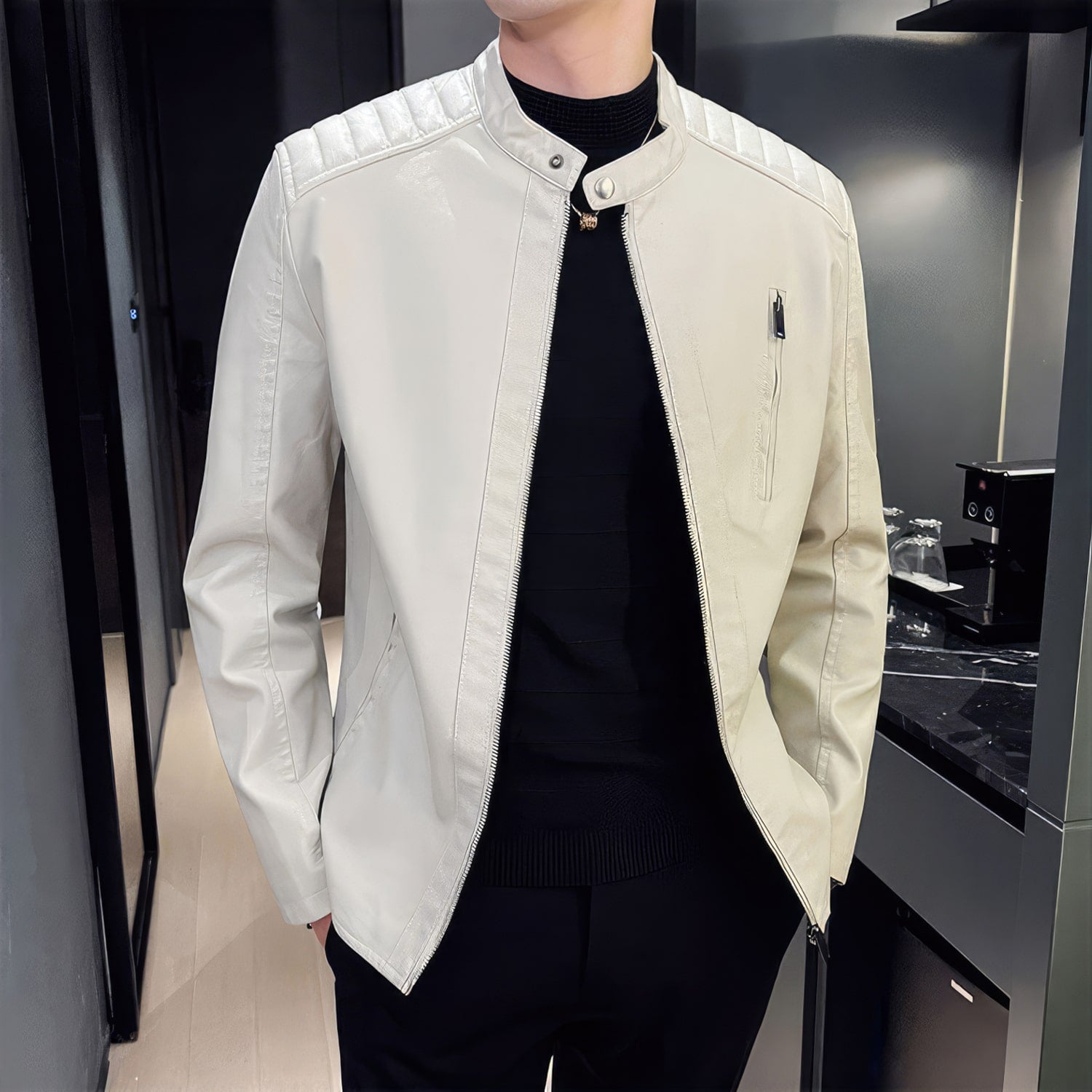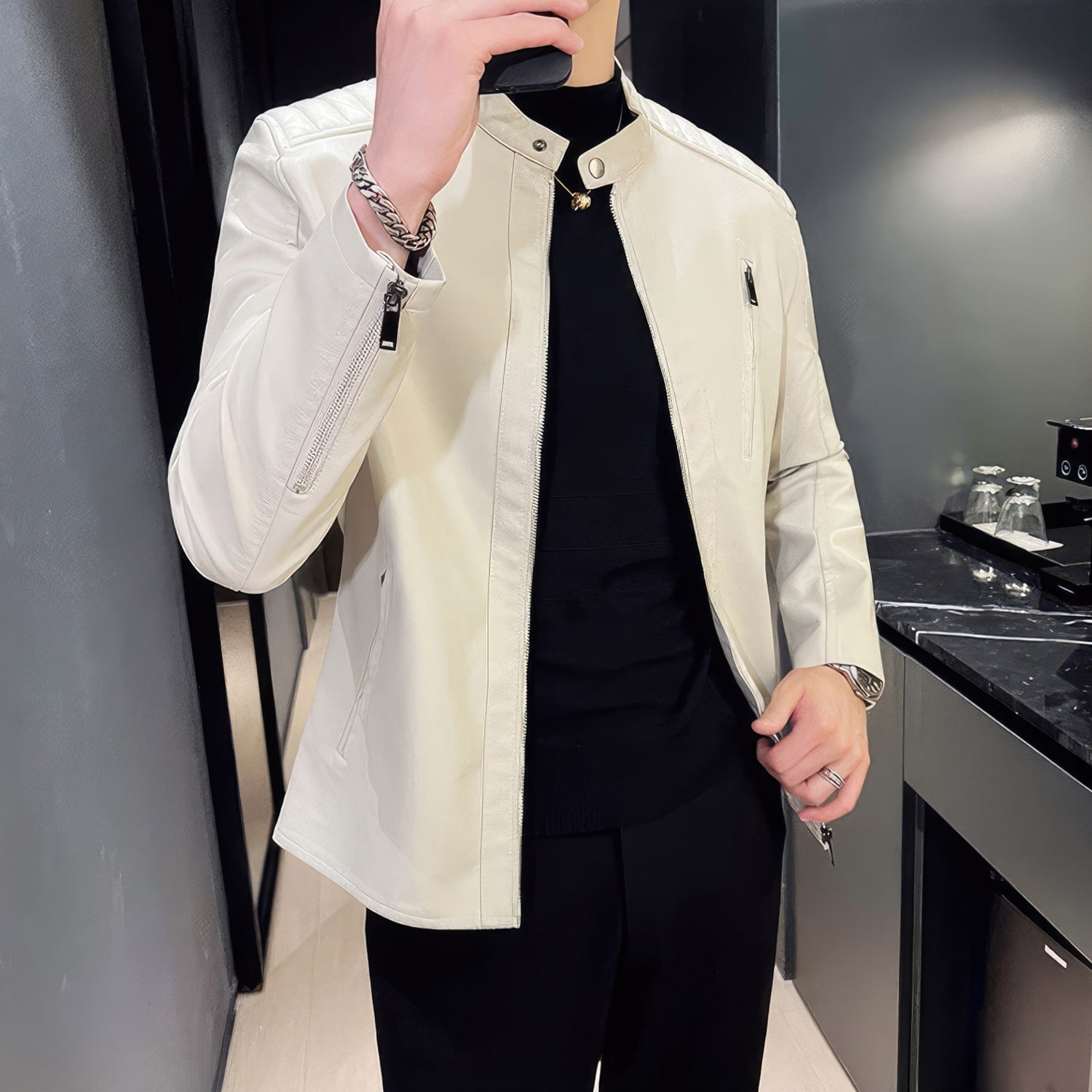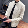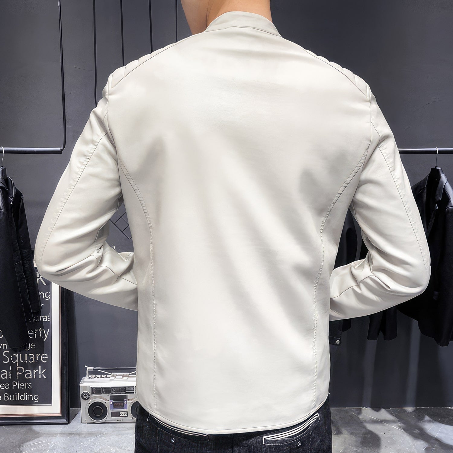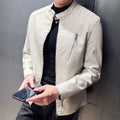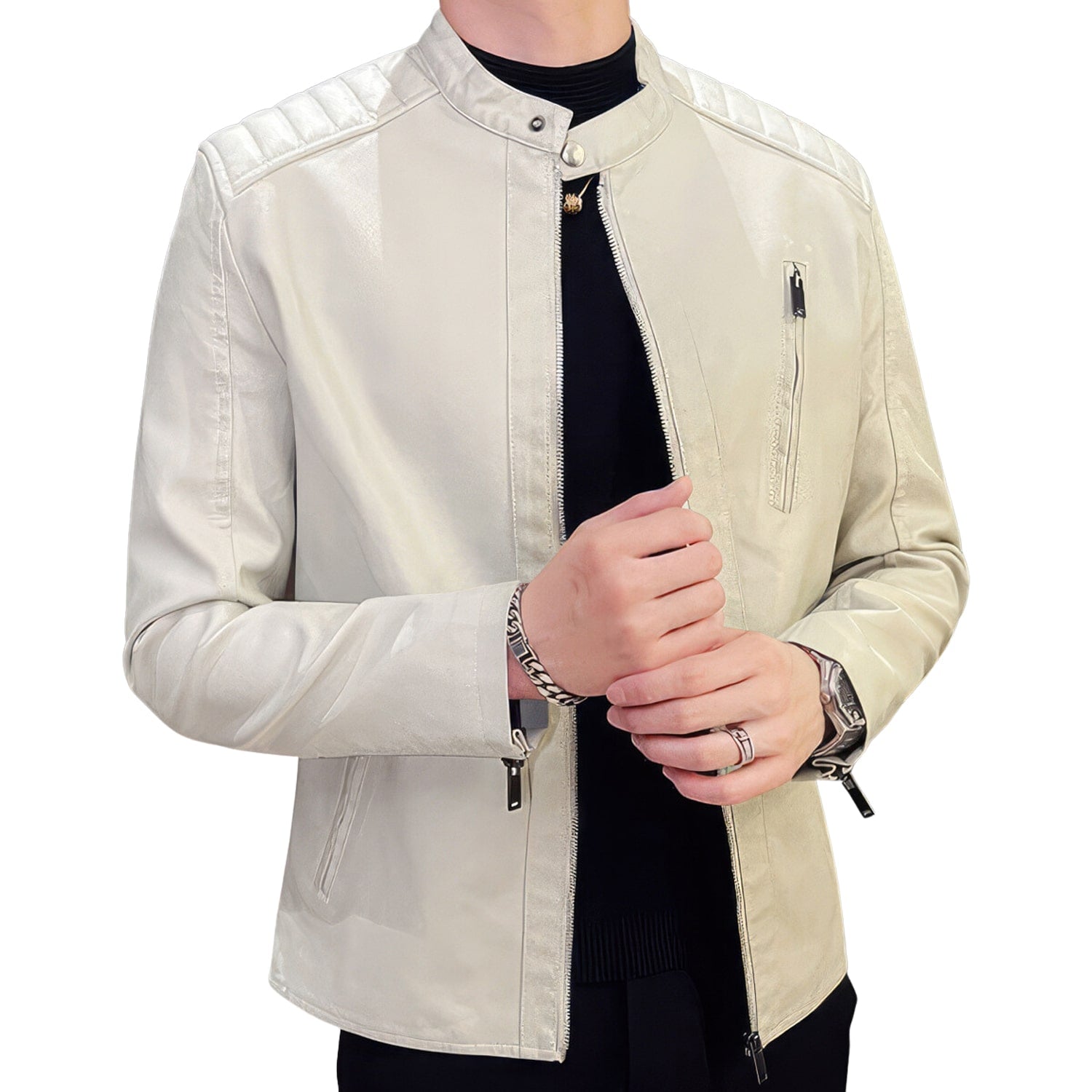Men’s White Genuine Sheepskin Quilted Shoulders Gentlemen Simple Casual Classic Slim Fit Moto Café Racer Leather Jacket