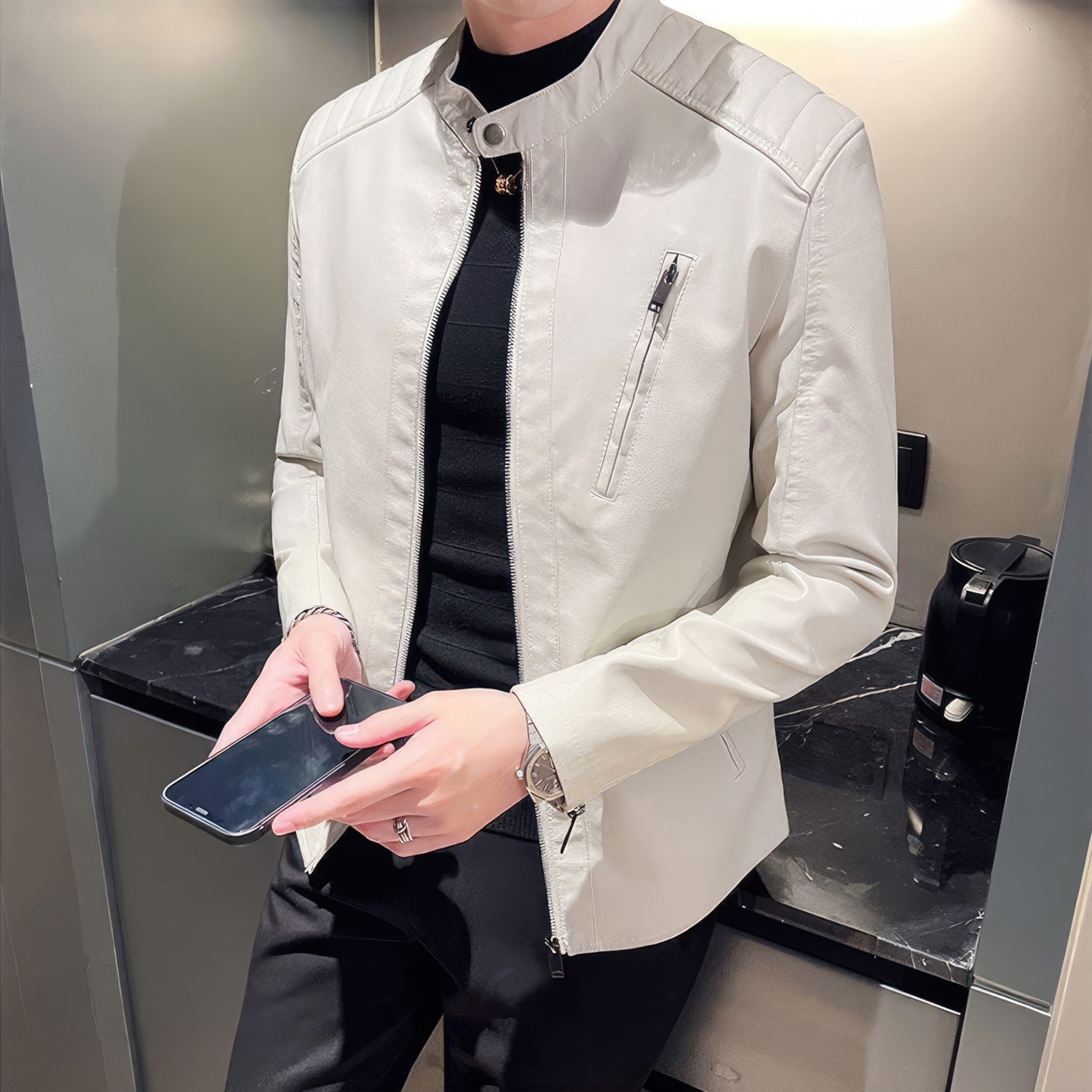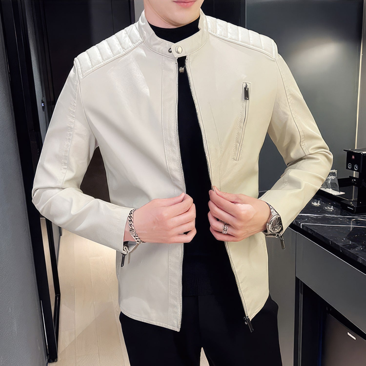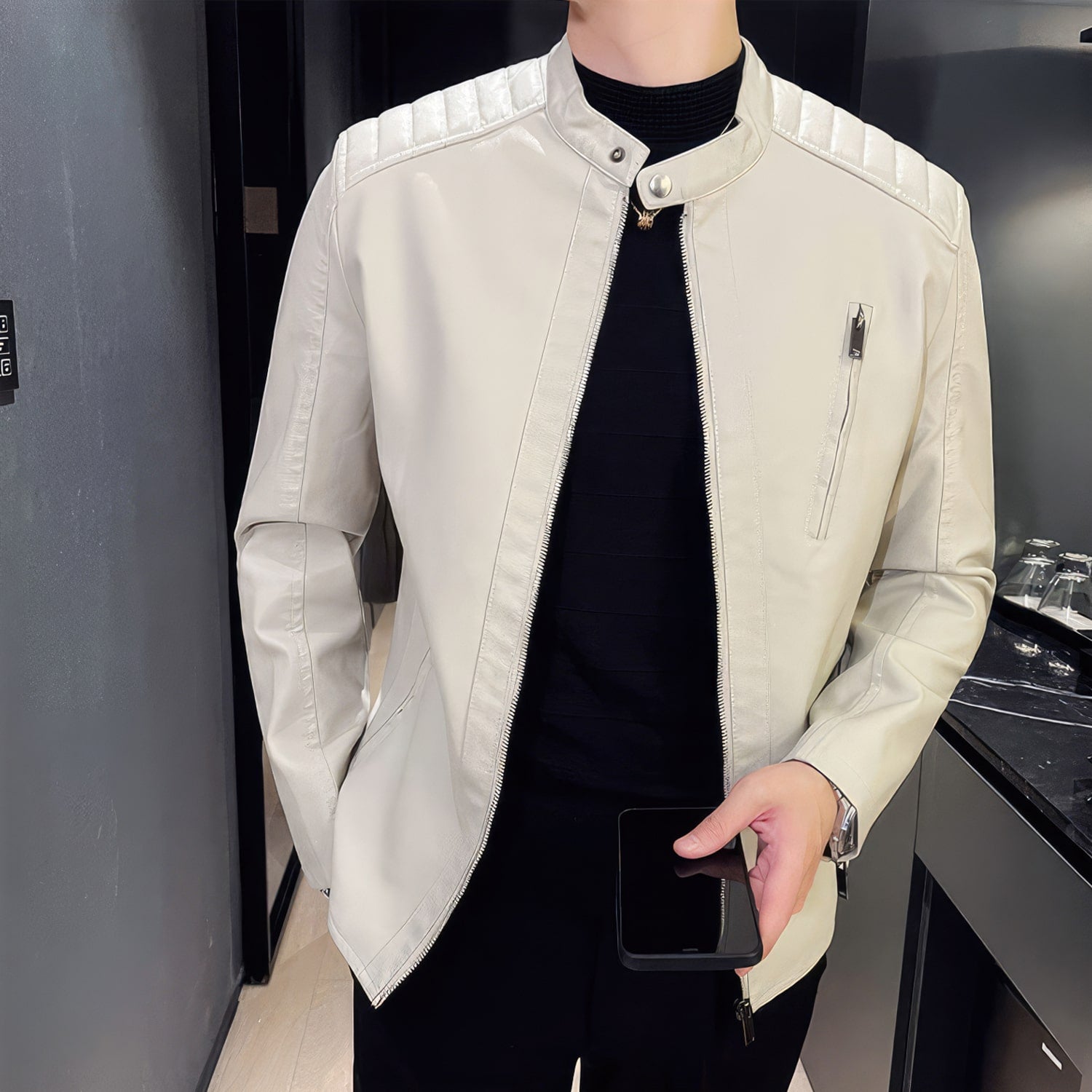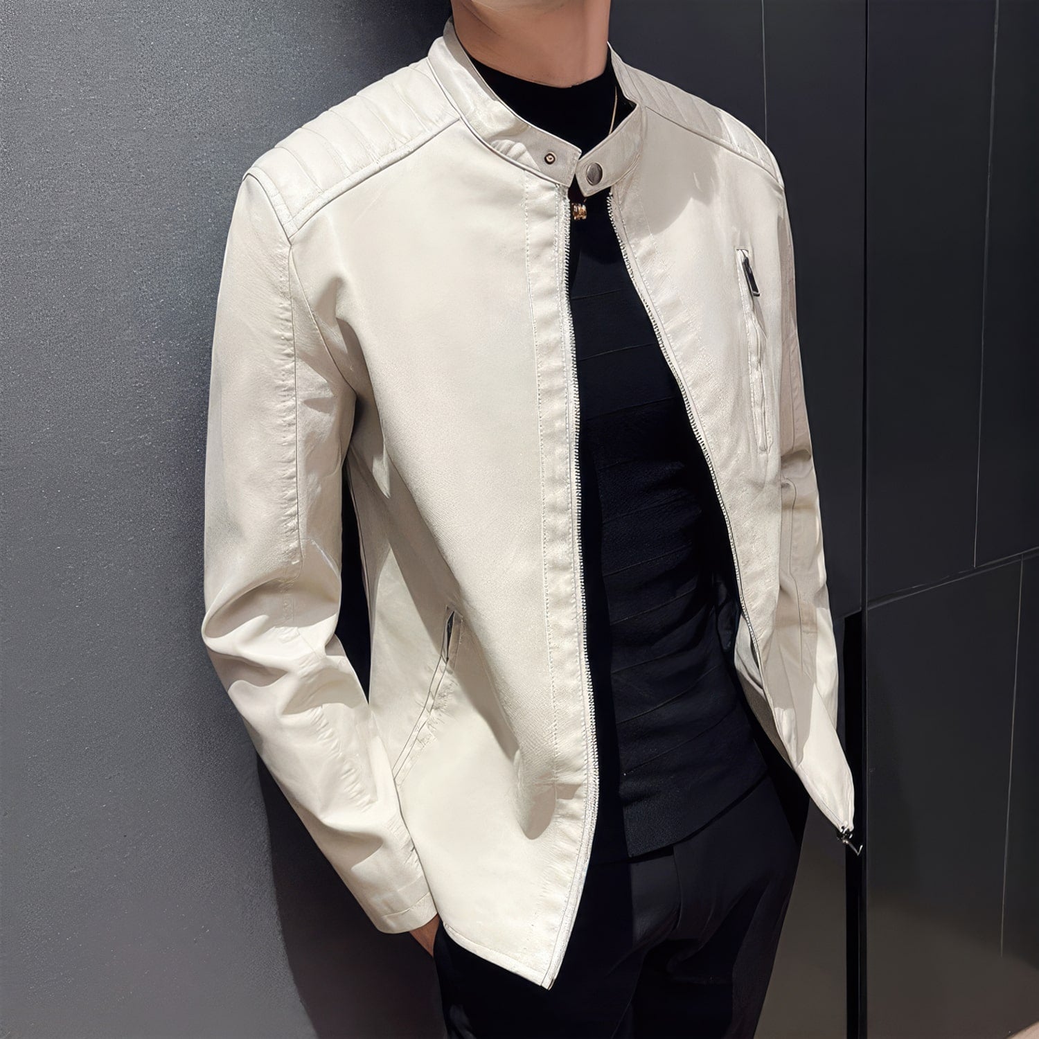 Men’s White Genuine Sheepskin Quilted Shoulders Gentlemen Simple Casual Classic Slim Fit Moto Café Racer Leather Jacket