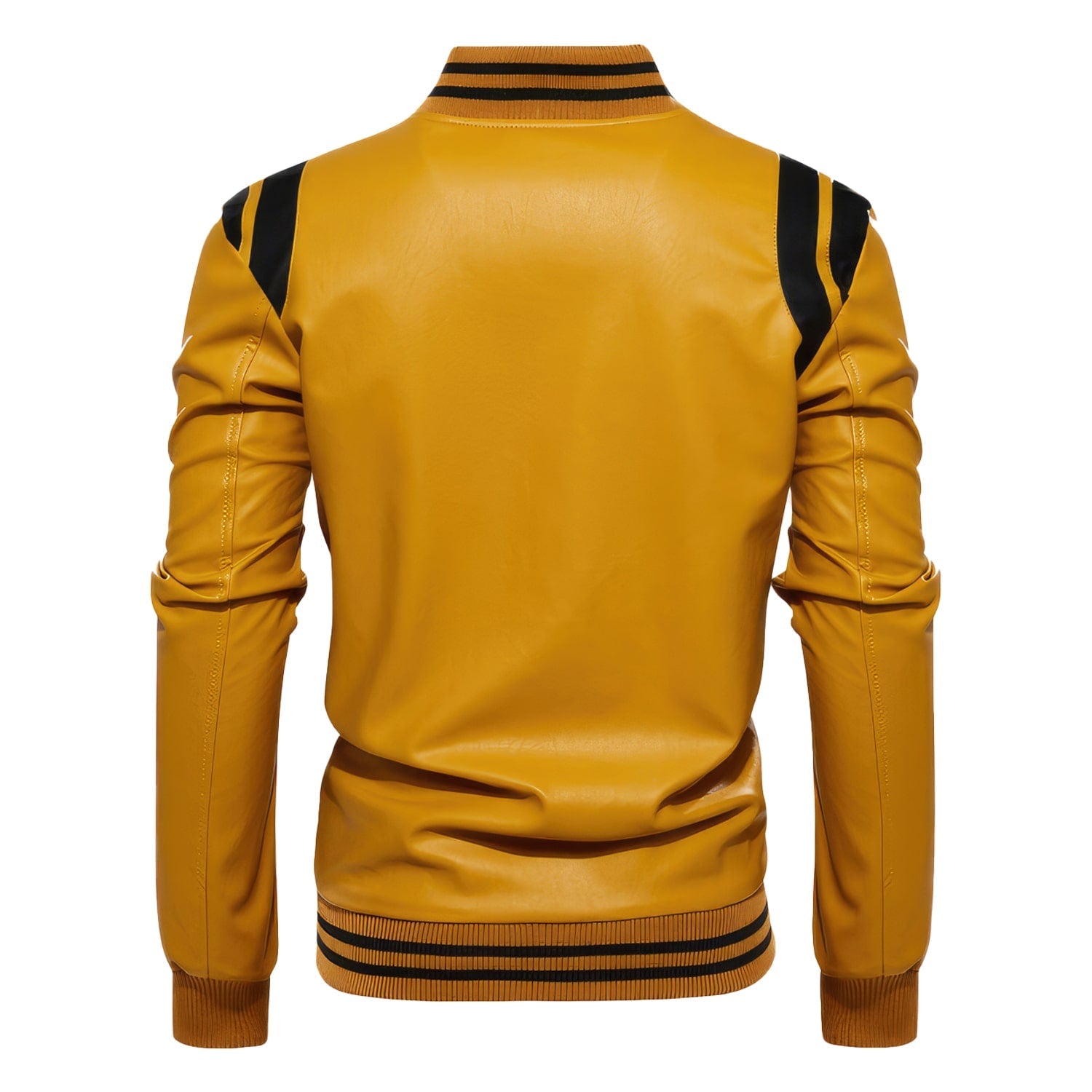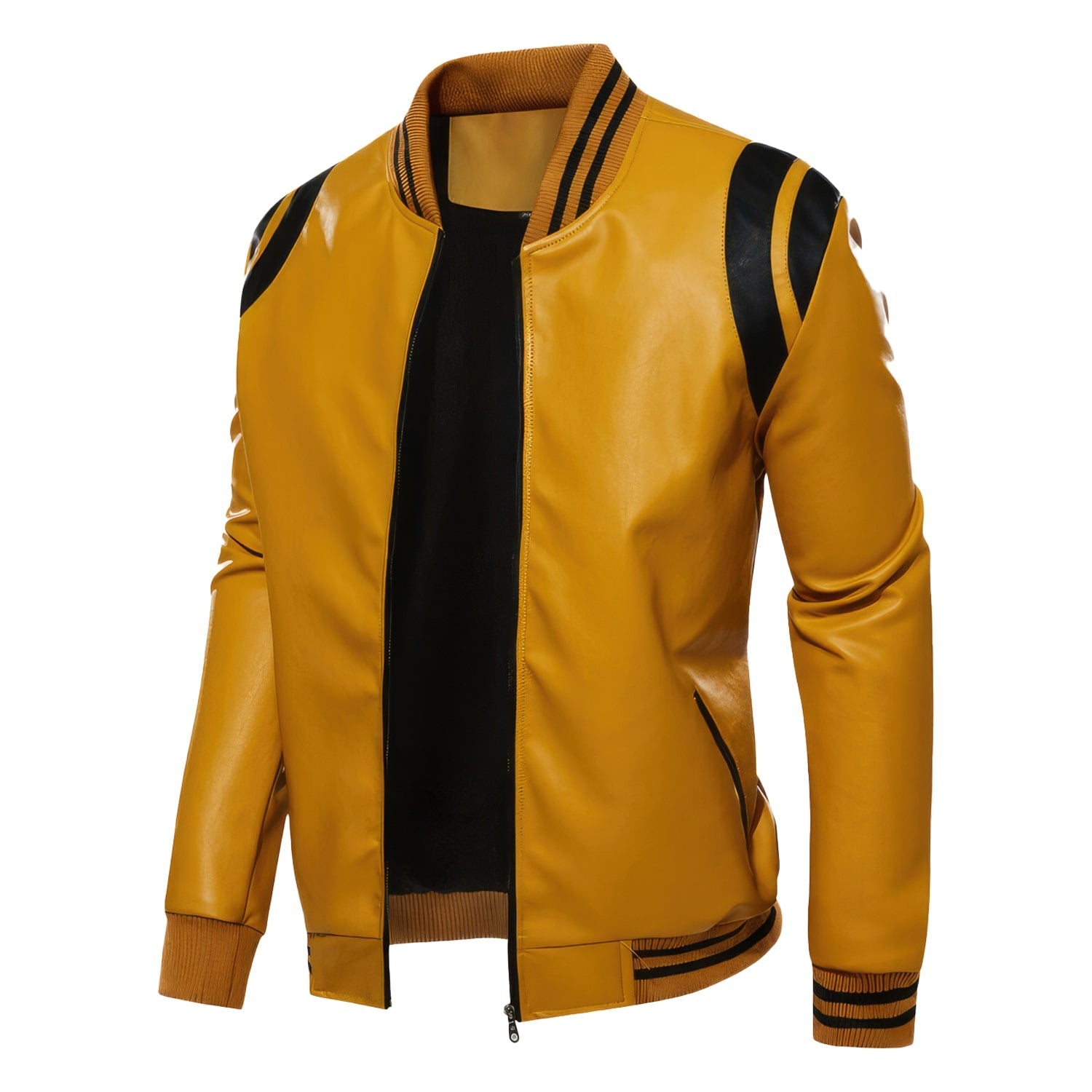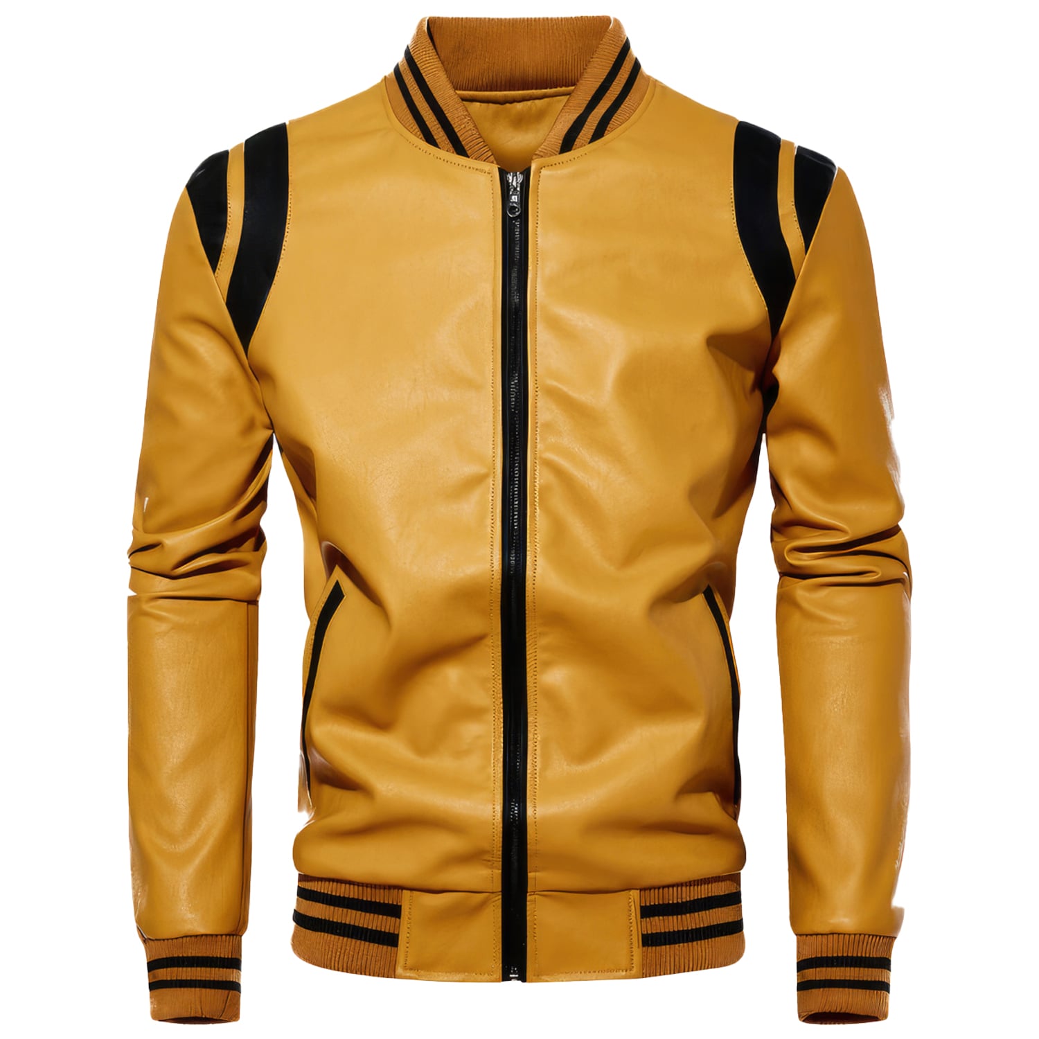 Men’s Yellow Biker Genuine Sheepskin Black Stripes Rib Knit Bomber Sporty Motorcycle Rider Slim Fit Leather Jacket