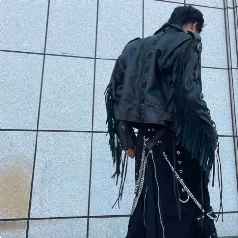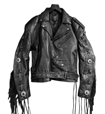 Men's Black Fringe Belt Genuine Leather Biker Jacket