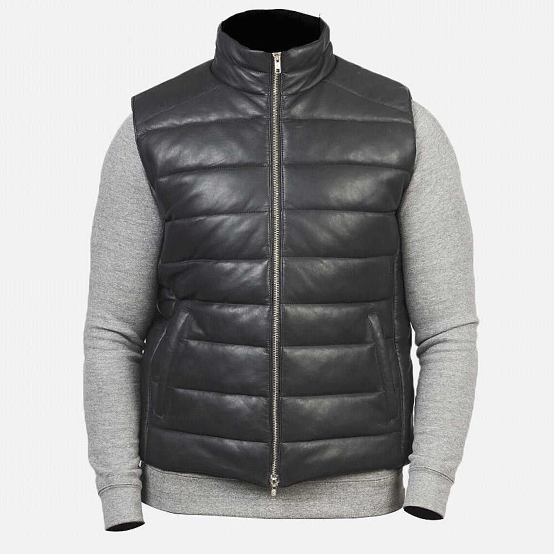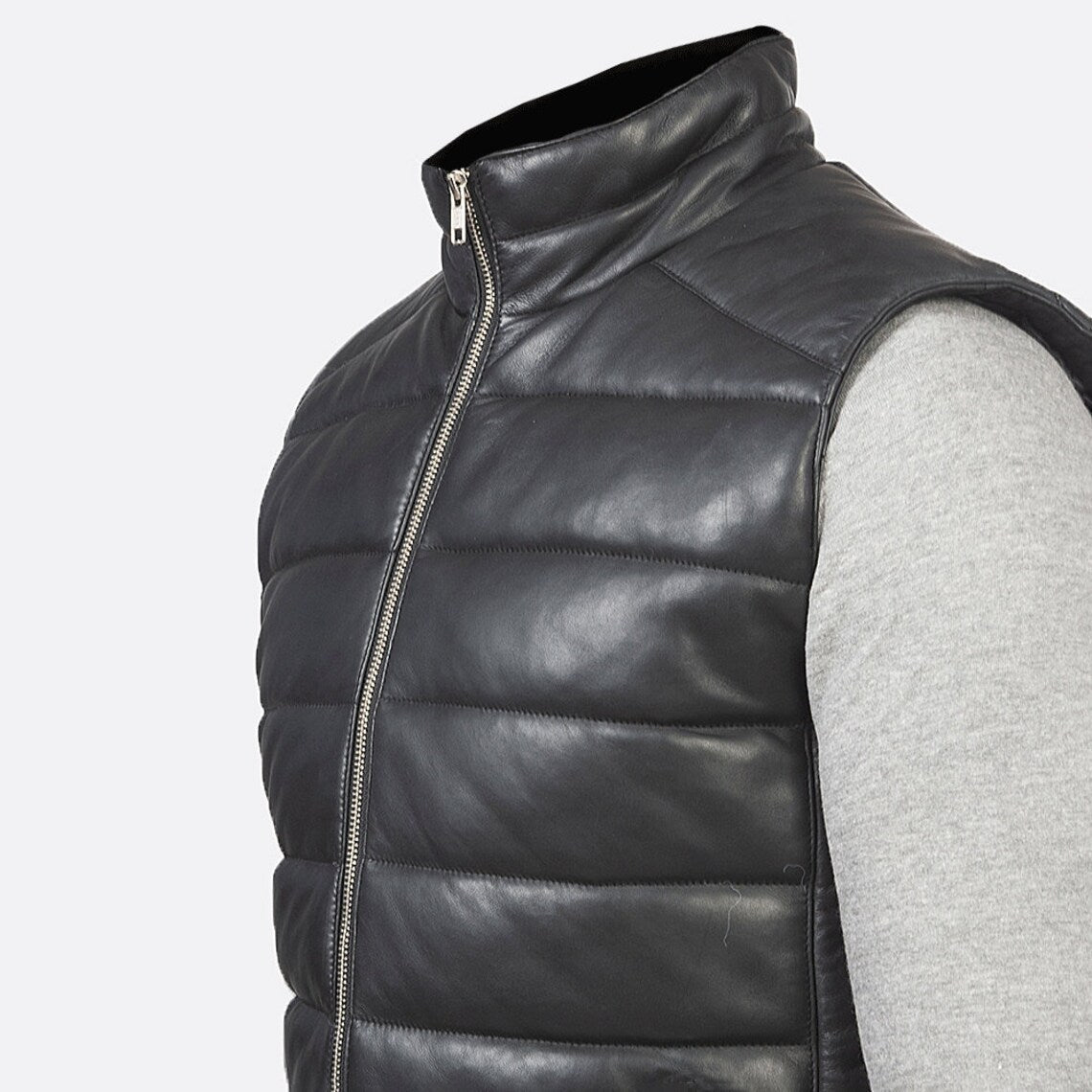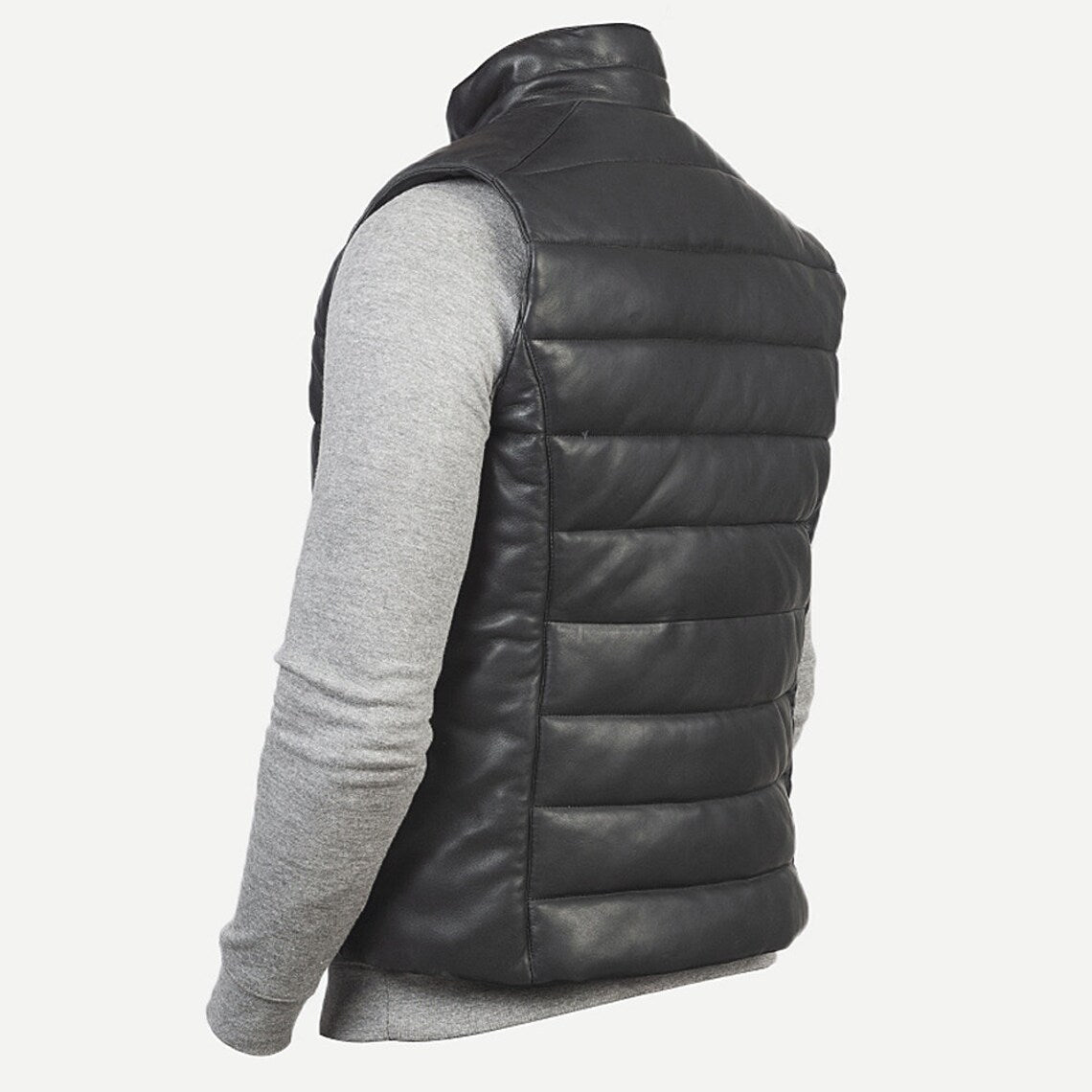Men's Black Leather Puffer Vest with Zipper Closure and Side Pockets