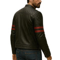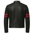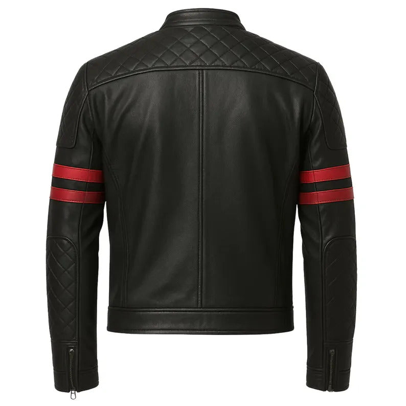 Men's Black Retro Biker Leather Jacket – Red Stripes with Quilted Shoulders & Sleeves