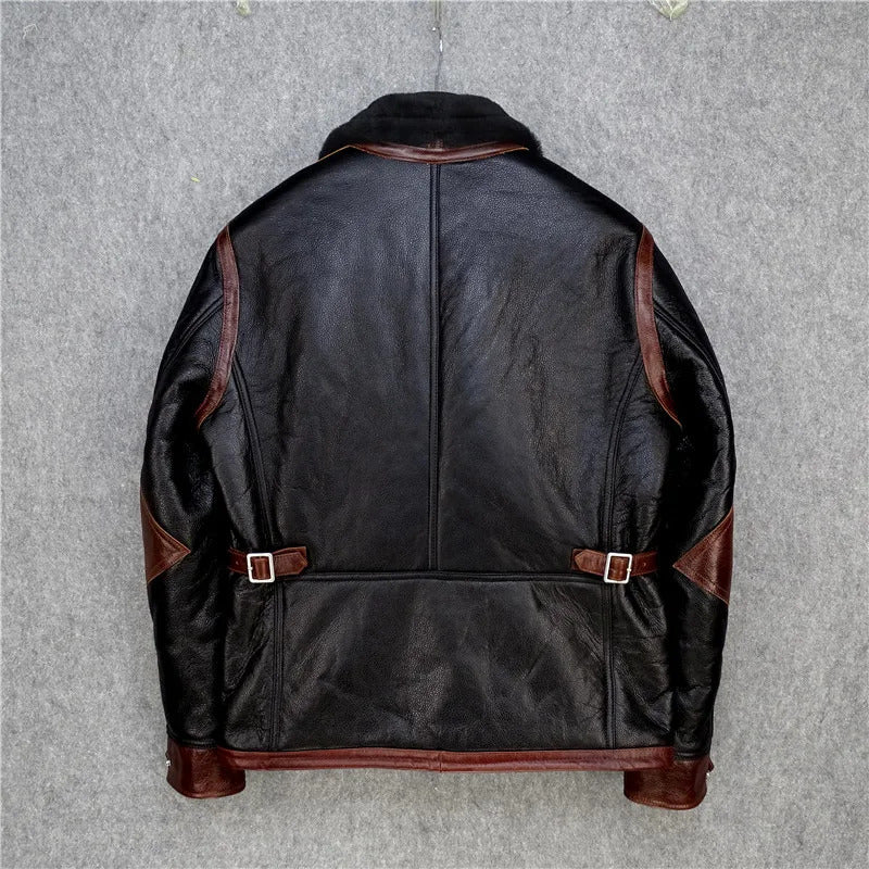 Men's Genuine Cow Leather Jacket with Shearling Faux Fur Lining