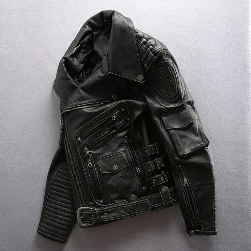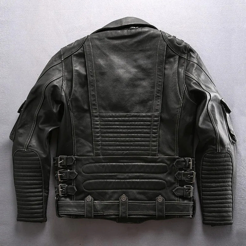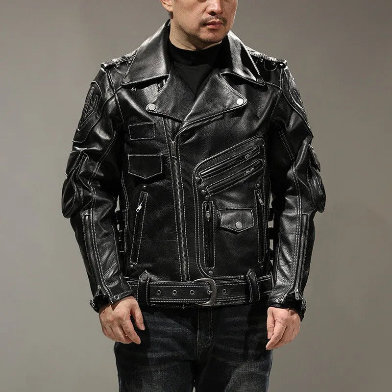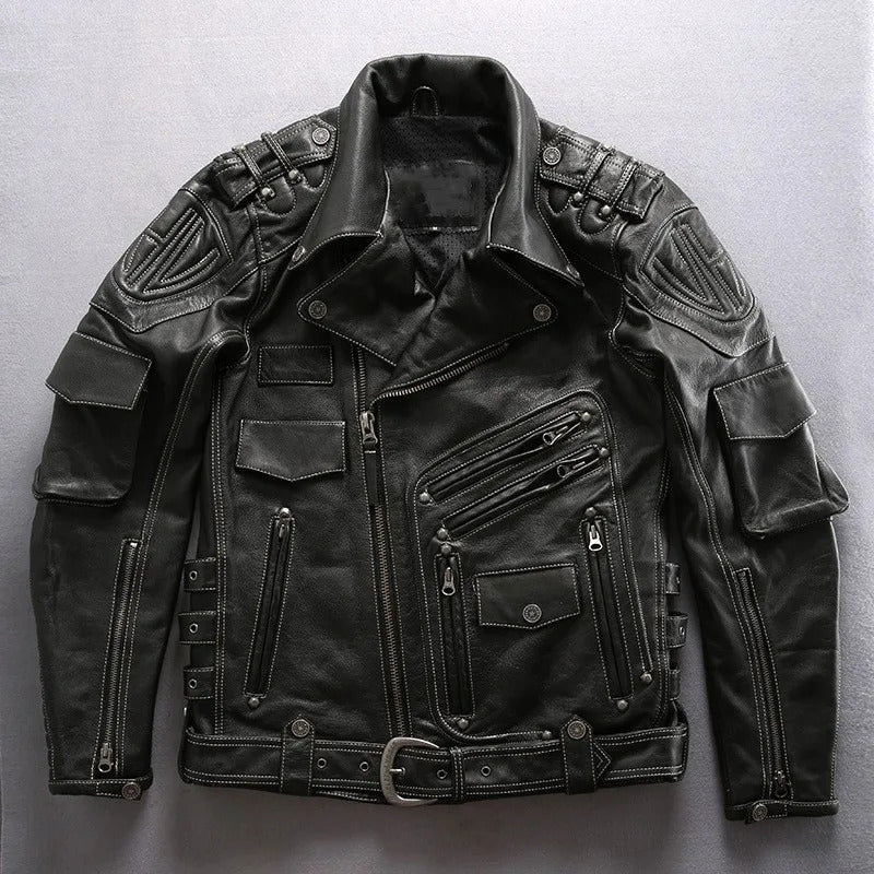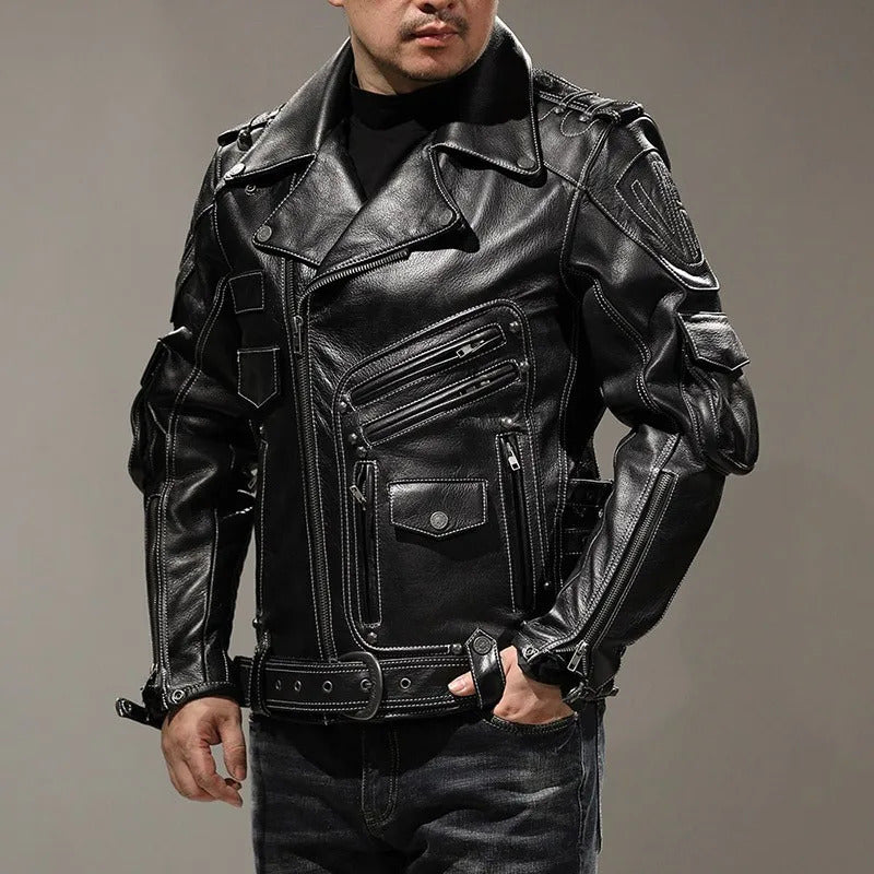 Men's Punk Style Genuine Cowhide Leather Motorcycle Jacket with Pockets