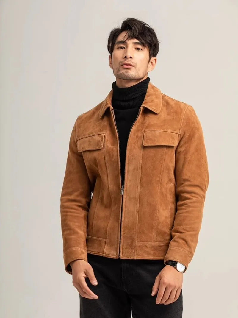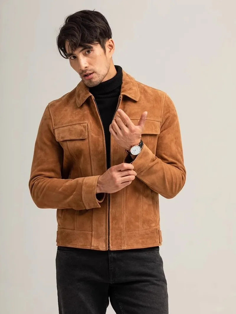 Men's Vintage Suede Sheepskin Motorcycle Jacket Short Coat with Zipper