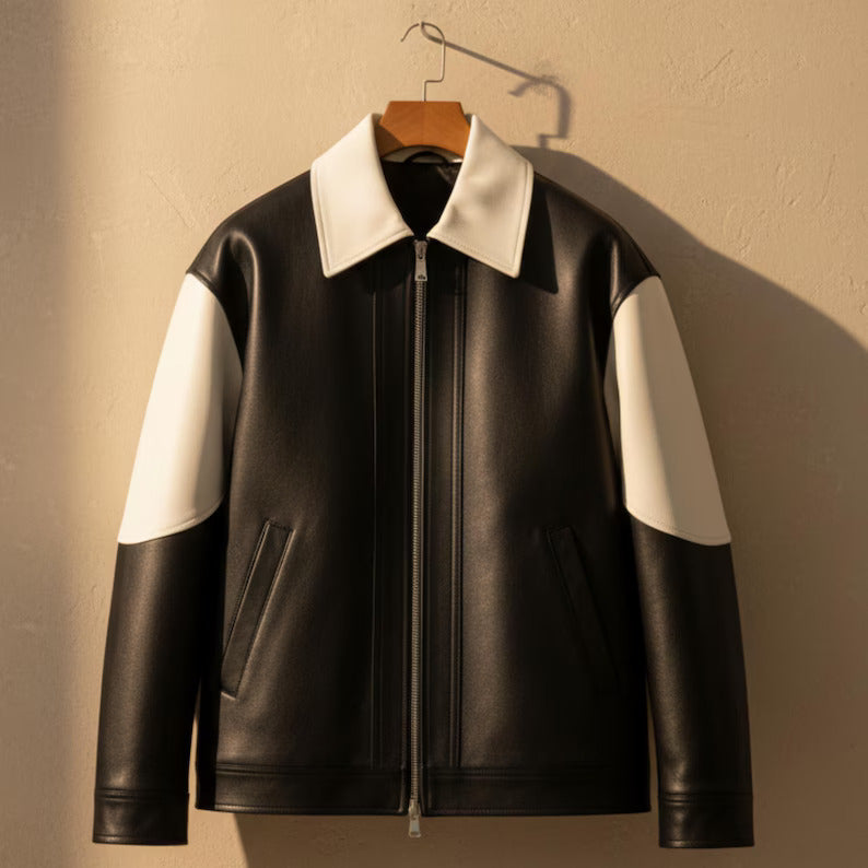 Featuring a modern moto-style design, this jacket combines rugged charm with a sleek silhouette, perfect for casual outings or motorcycle rides. The two-tone color adds a bold, eye-catching look, while the smooth inner lining ensures comfort for all-day wear.