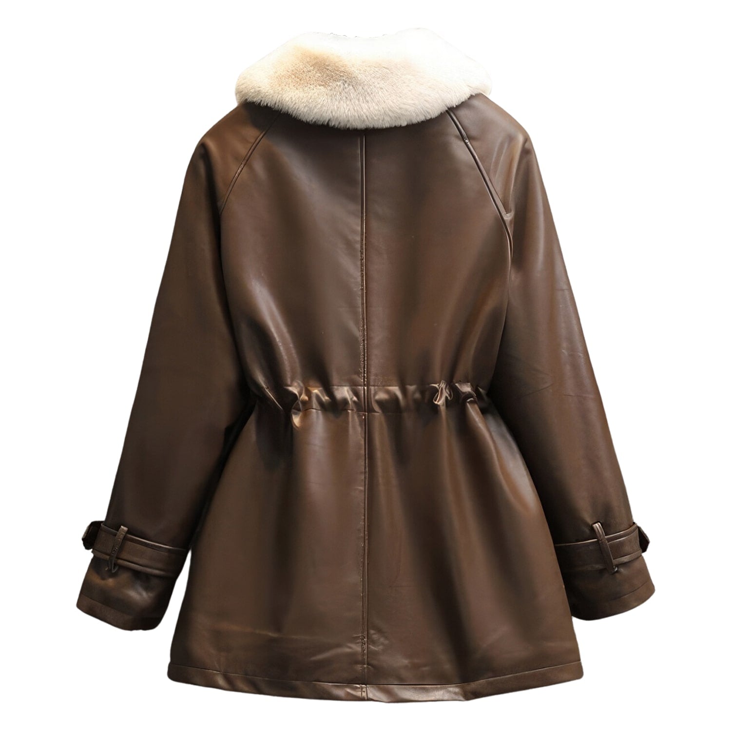 Women’s Auburn Genuine Sheepskin Sherpa Shearling Faux Fur Lined Casual Fashion Thick Oversized Waist Drawstring Leather Jacket