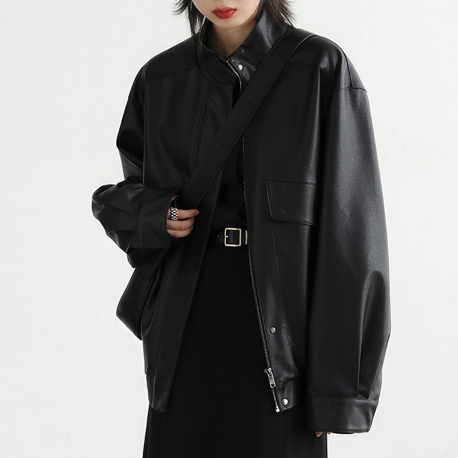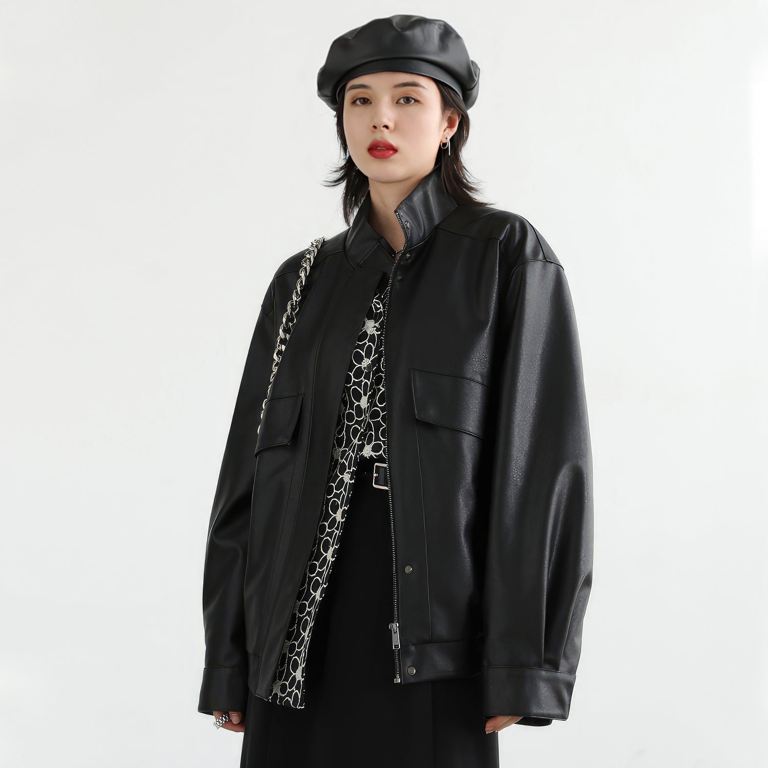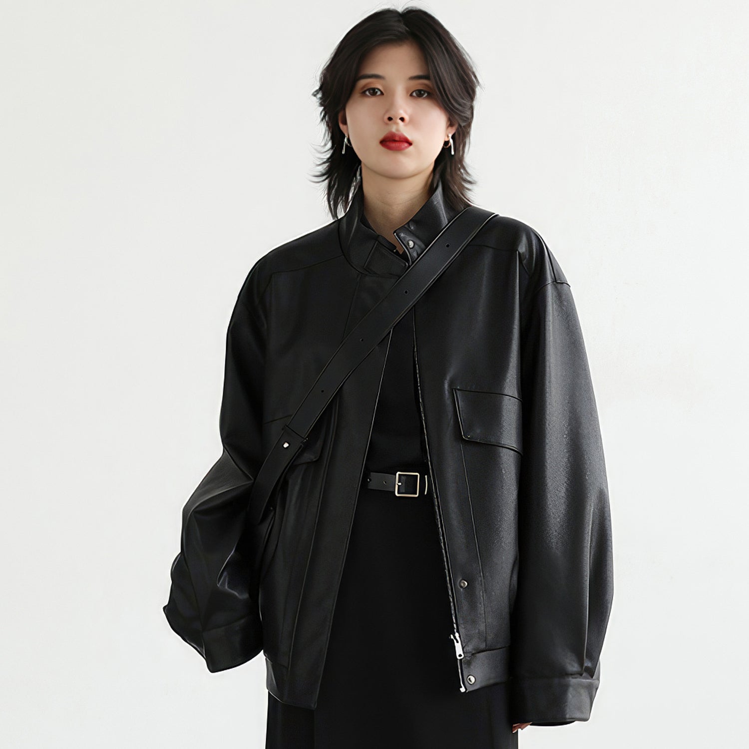 Women’s Black Biker Genuine Sheepskin Drop Shoulders Moto Racer Oversized Casual Streetwear Loose Smooth Leather Jacket