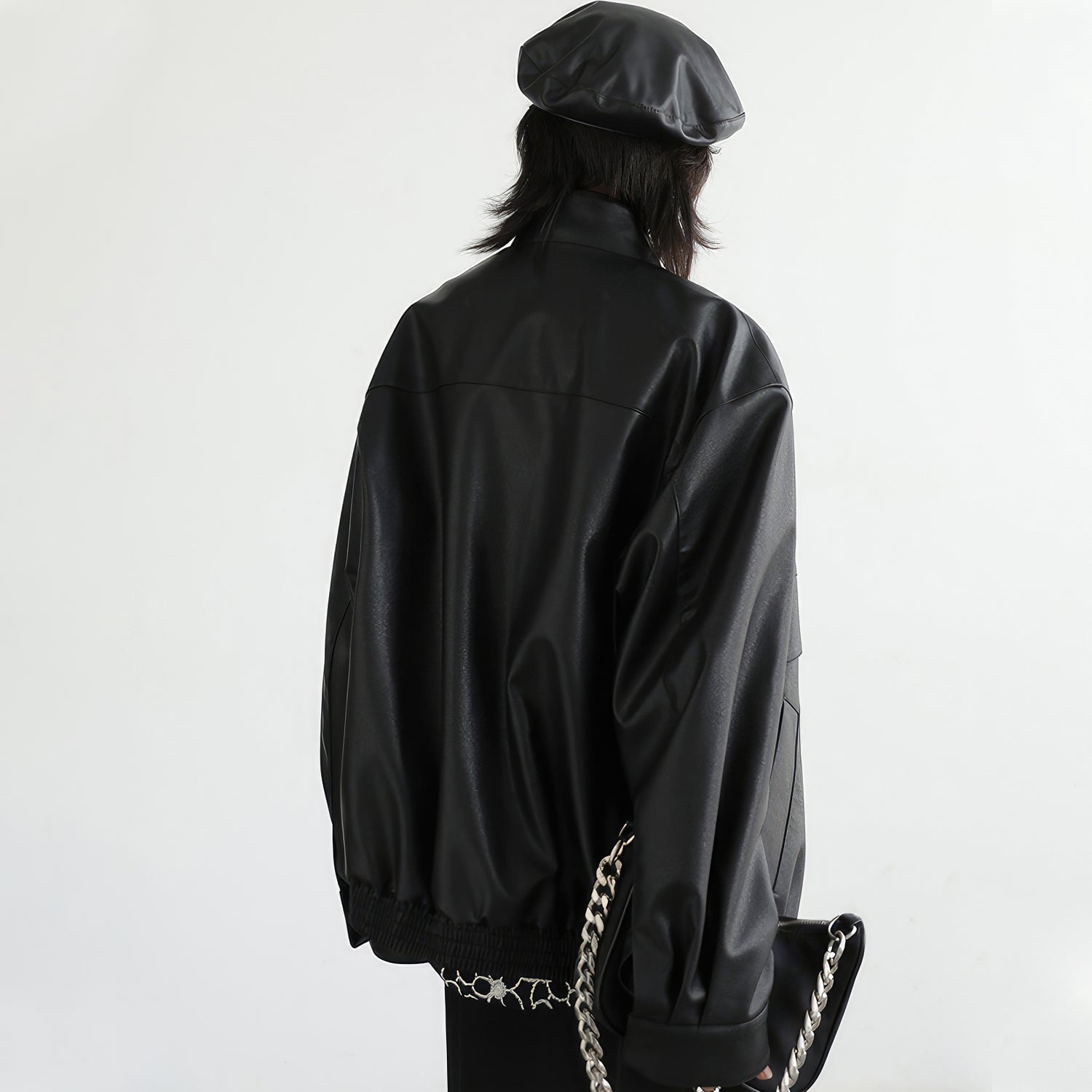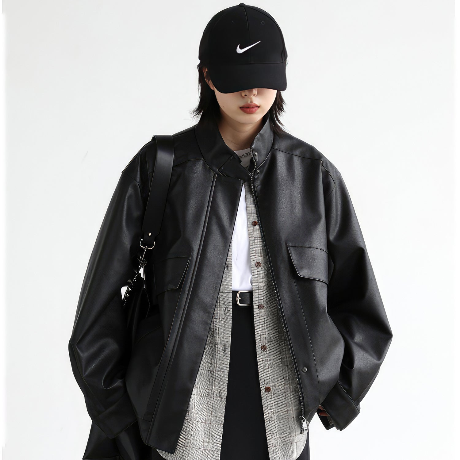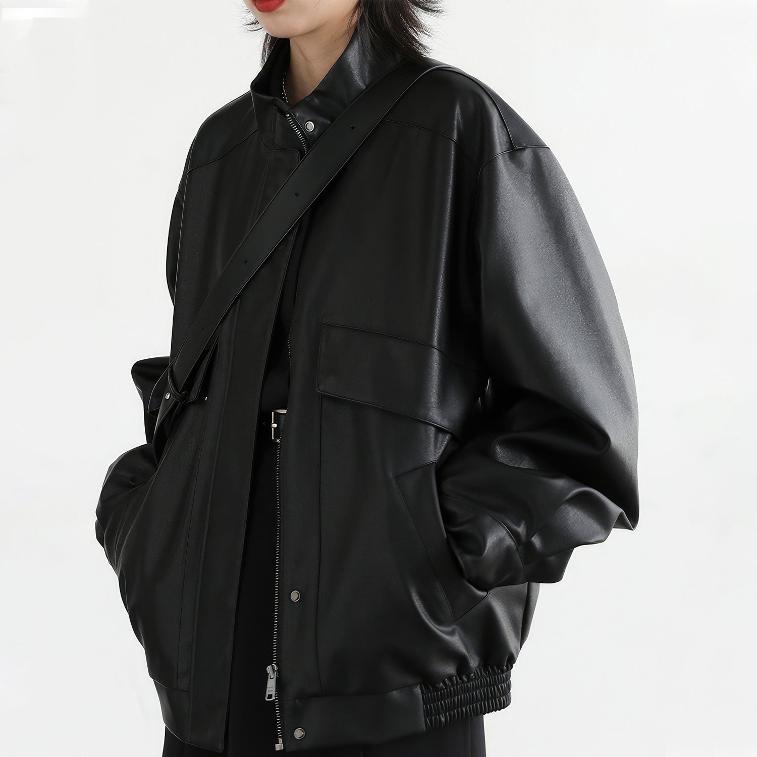 Women’s Black Biker Genuine Sheepskin Drop Shoulders Moto Racer Oversized Casual Streetwear Loose Smooth Leather Jacket