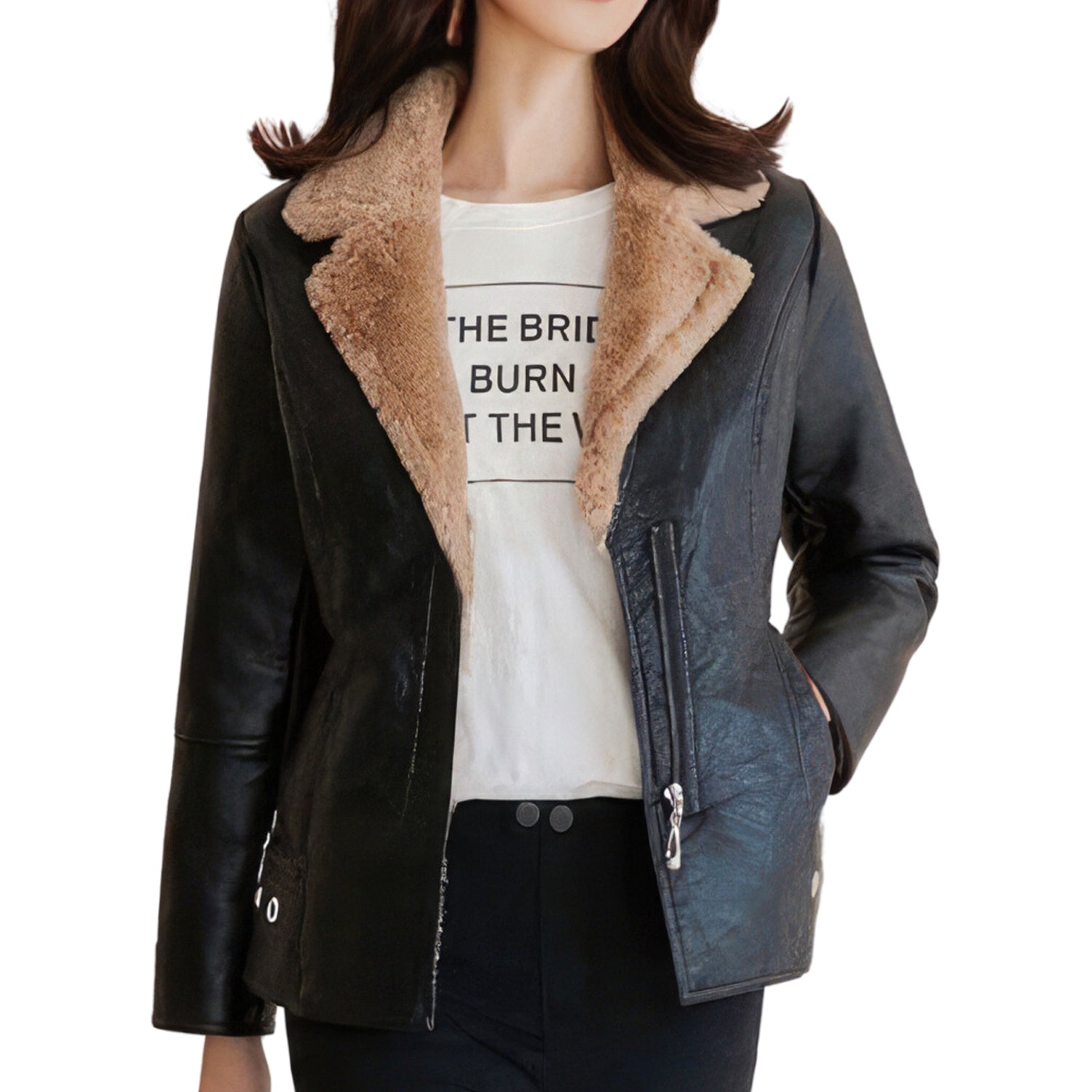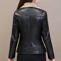 Women’s Black Biker Genuine Sheepskin Sherpa Shearling Faux Fur Lined Cafe Racer Korean Fashion Motorcycle Slim Fit Leather Jacket