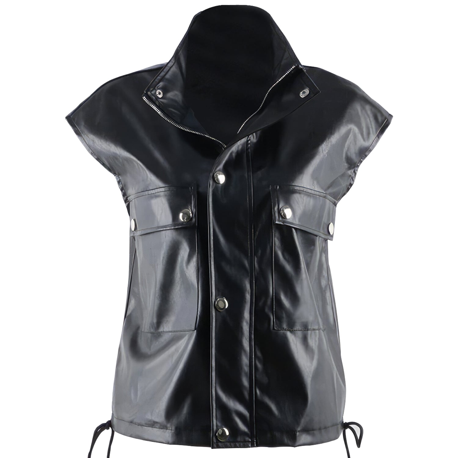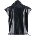 Women’s Black Biker Genuine Sheepskin Stand Collar Sleeveless Vest Moto Café Racer Casual Loose Leather Waistcoat