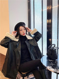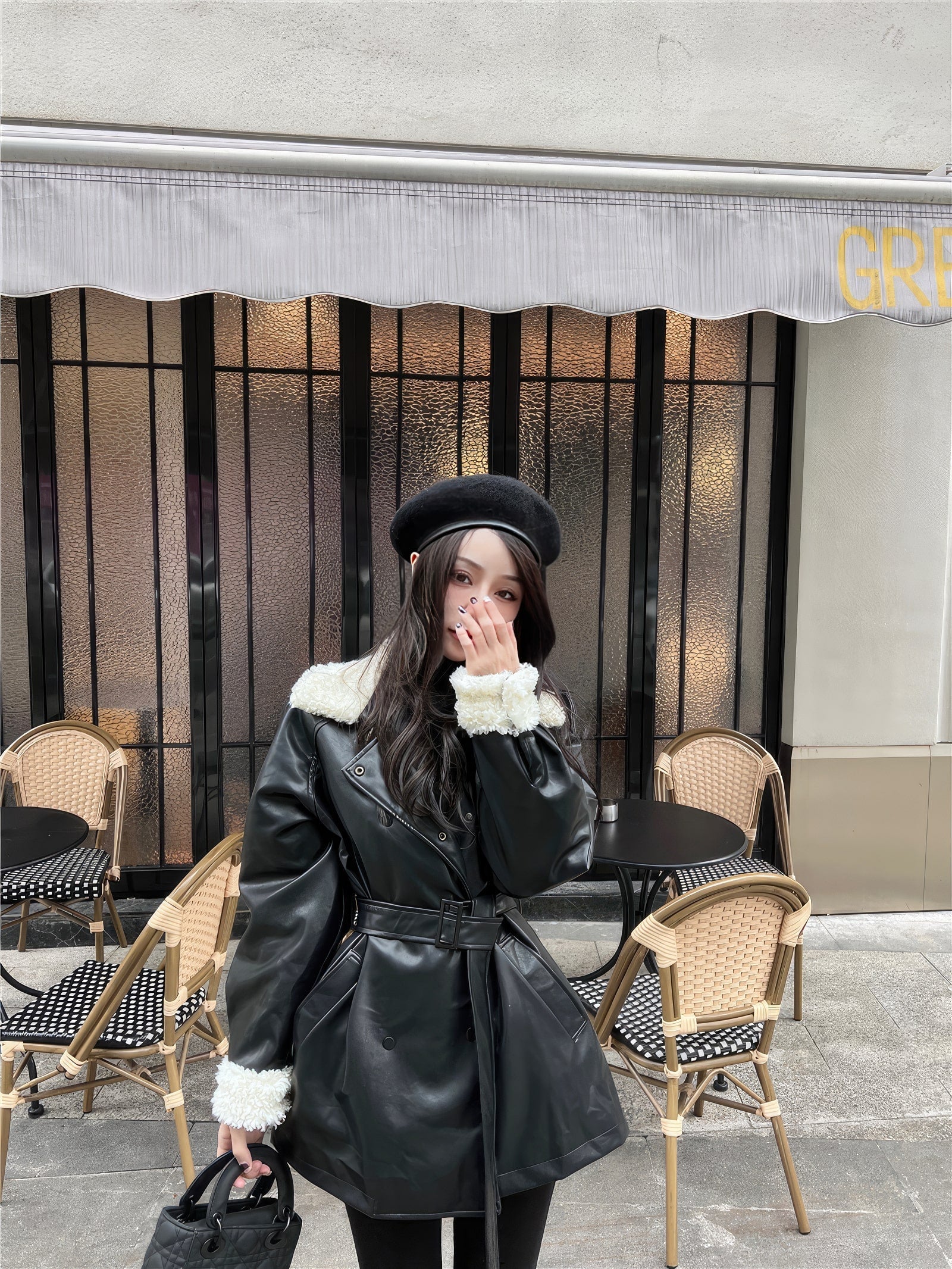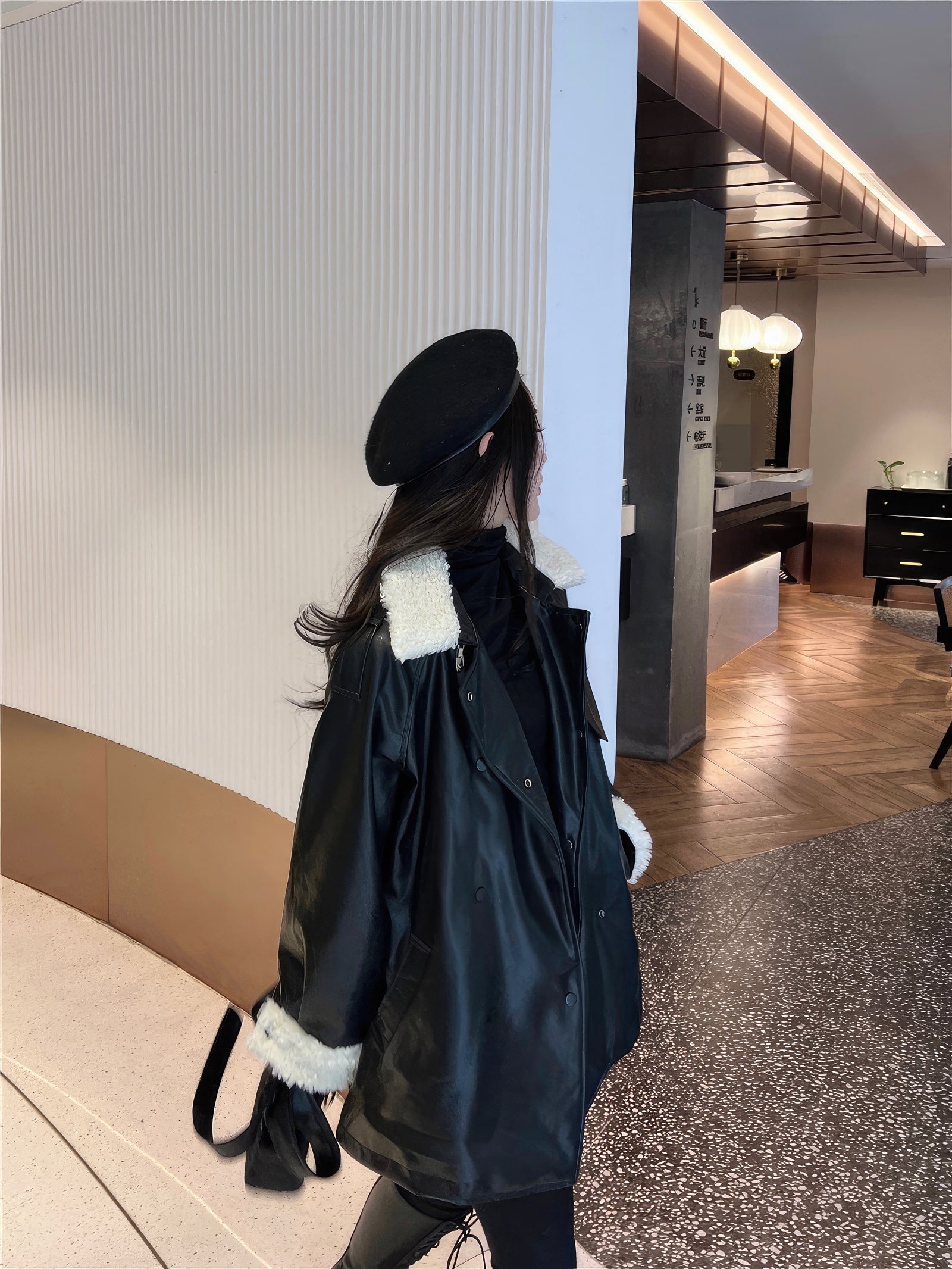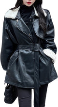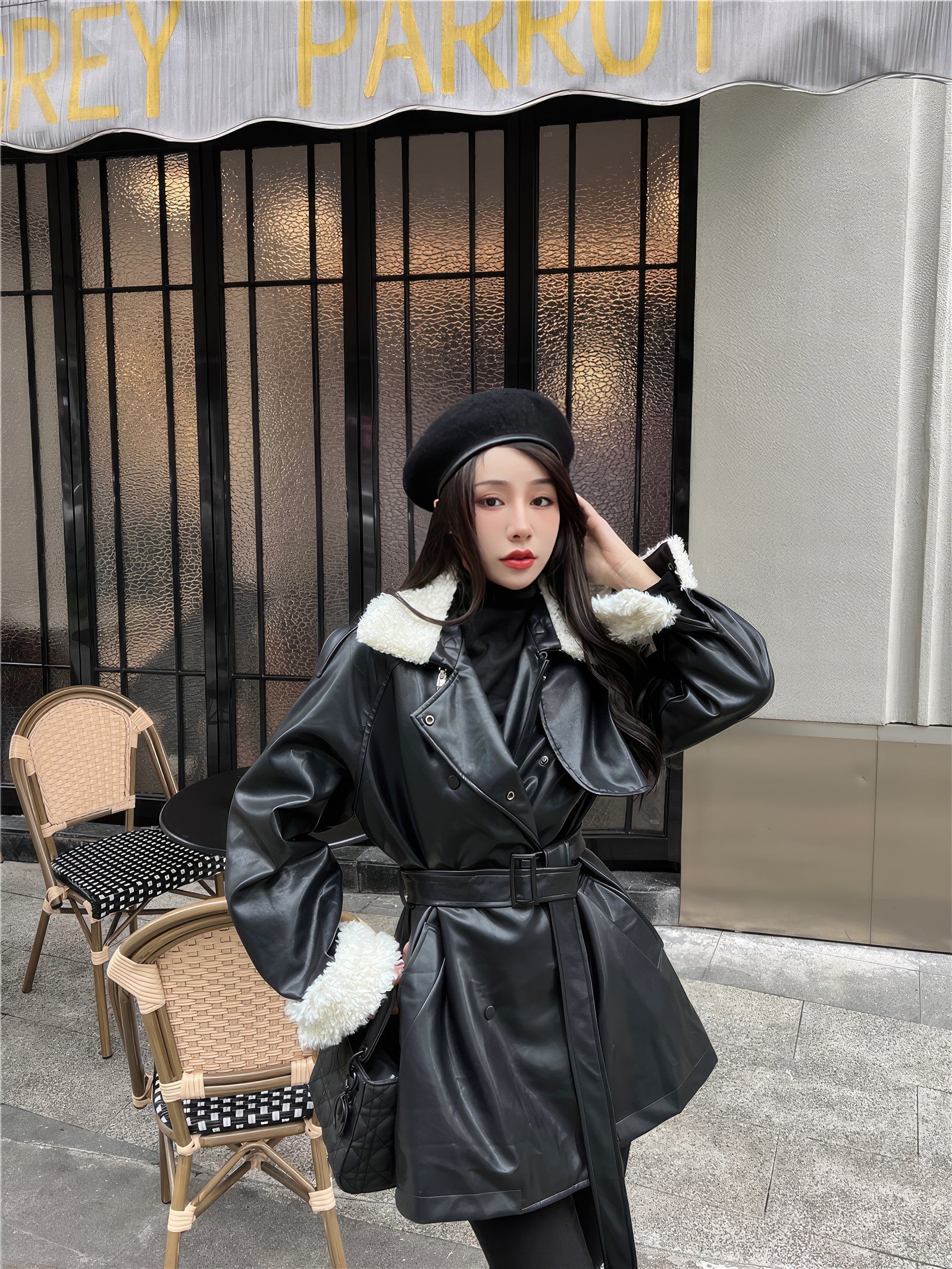 Women’s Black Genuine Lambskin Sherpa Shearling Faux Fur Collar Warm Casual Oversized Streetwear Leather Trench Coat