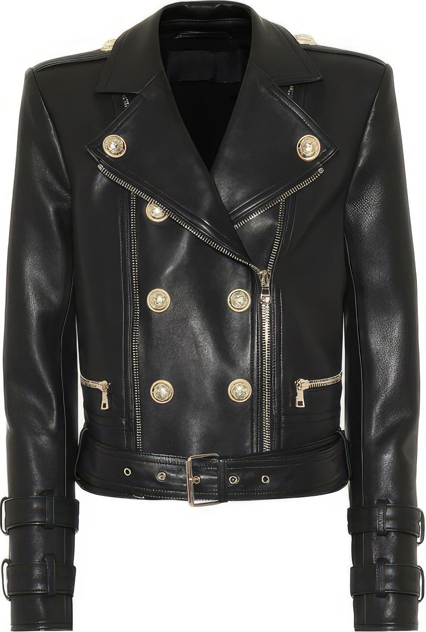 Enhance your wardrobe with the Women’s Black Genuine Sheepskin Leather Jacket. Crafted from high-quality sheepskin, this jacket offers unrivaled comfort and long-lasting durability. It features a stylish notched collar and an asymmetric crossover design that lends a distinctive fashion-forward appeal. The jacket is adorned with fashionable golden buttons, buckle, and zips for an added chic touch. A secure YKK zipper closure ensures a snug fit, while the adjustable belts at the waist and cuffs allow for versatile styling. Lightweight and fashionably casual, this classic rider leather jacket is a stylish addition to any outfit.