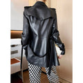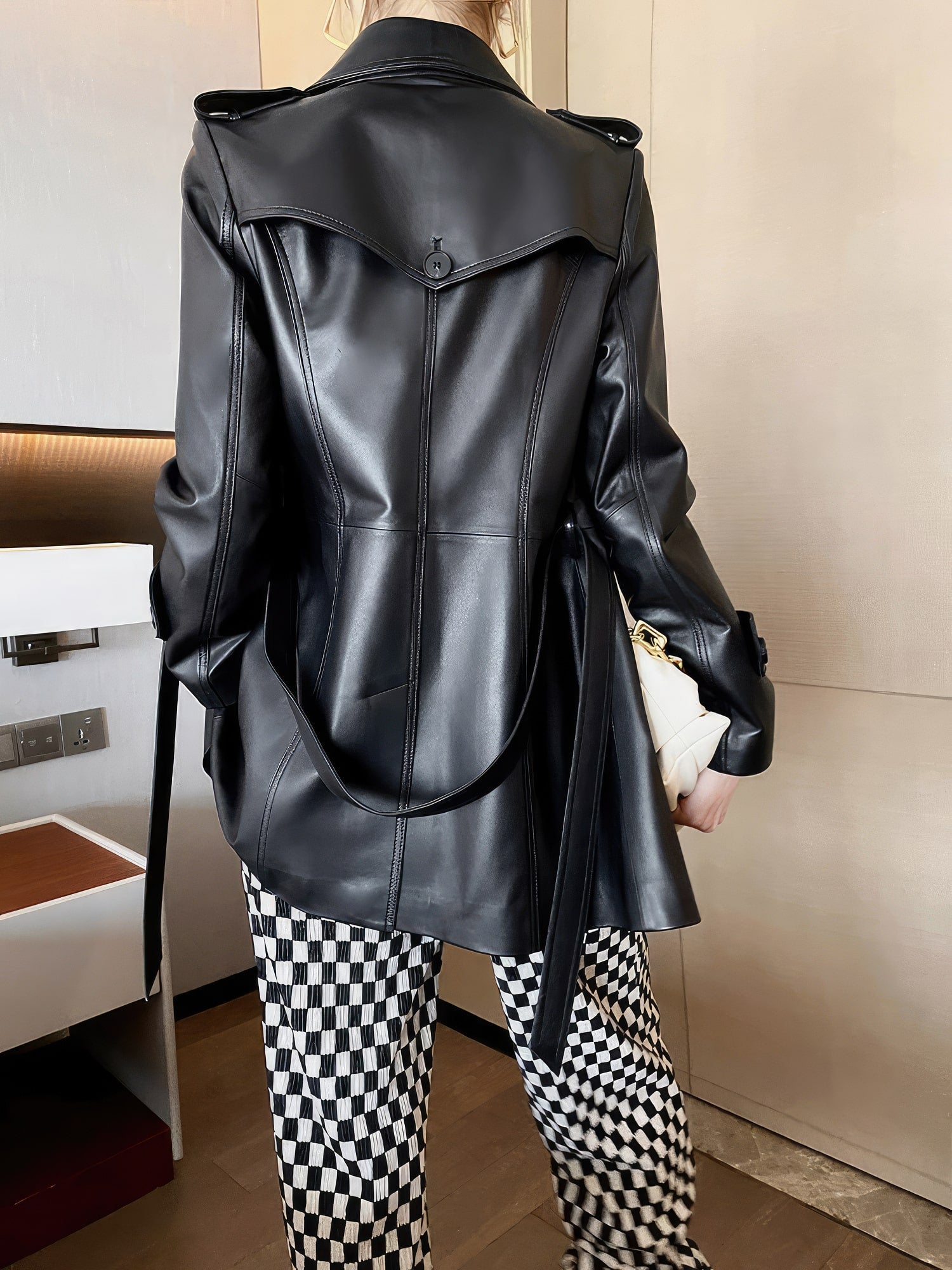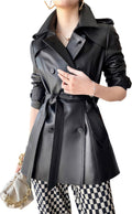 Women’s Black Genuine Sheepskin Double Breasted British Style Smooth Office Outfit Fashionable Belted Leather Trench Coat