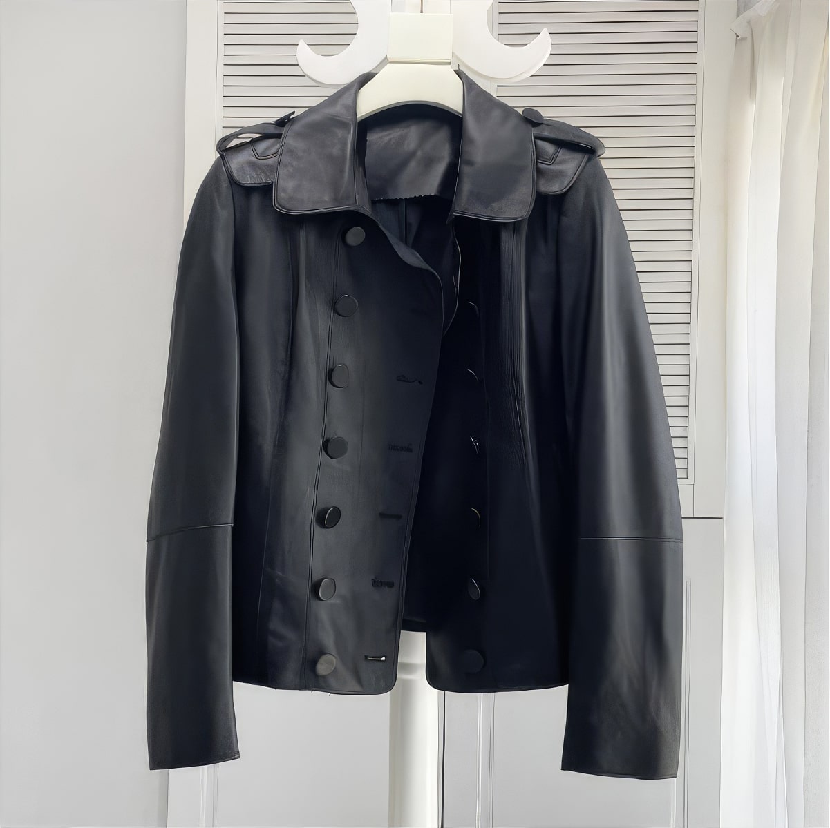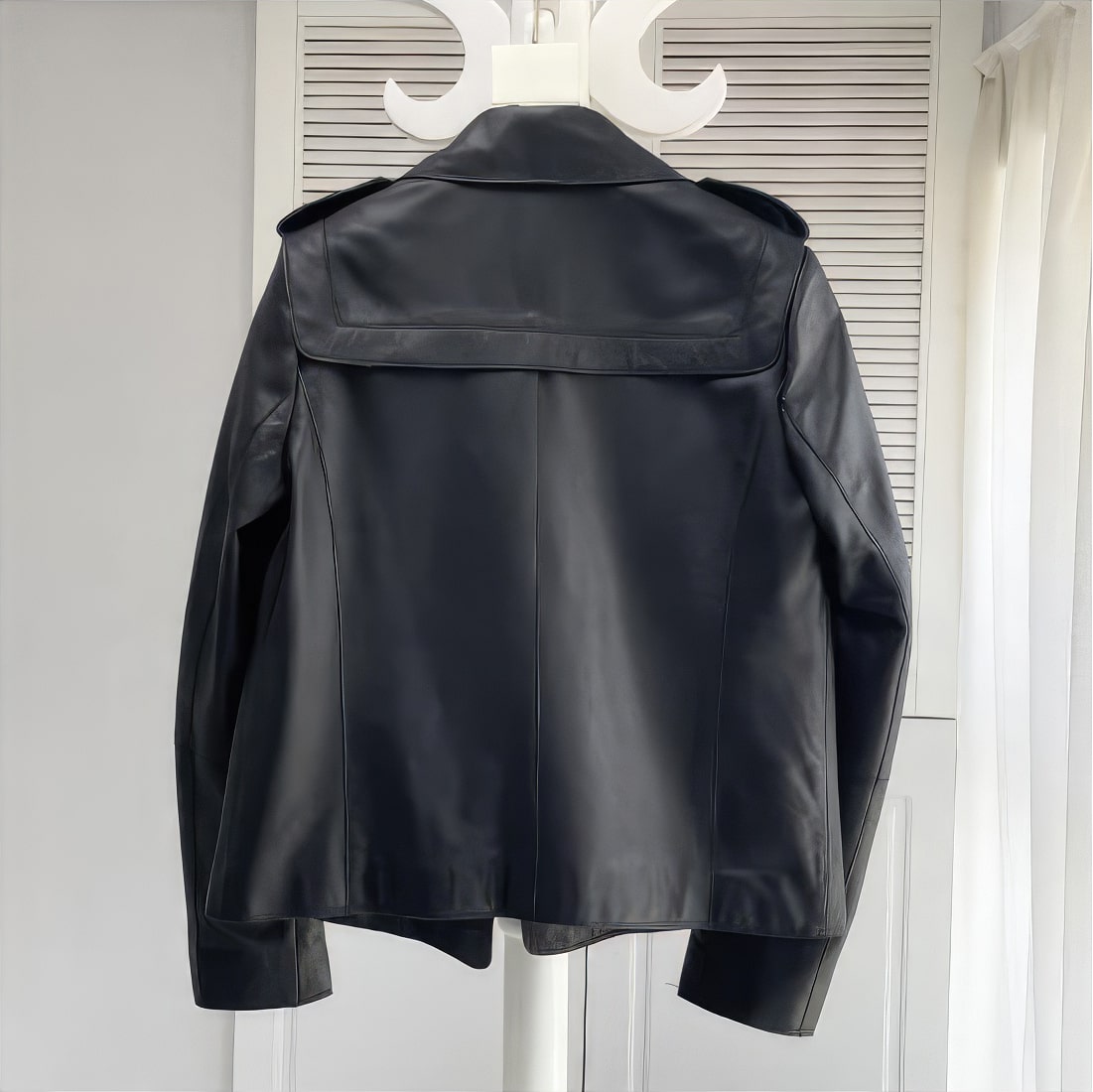 Add a touch of sophistication to your winter wardrobe with our Women’s Black Genuine Sheepskin Double Breasted Winter Vintage Korean Fashion Chic Outfit Trendy Plain Leather Jacket. Tailored from 100% genuine sheepskin leather, this jacket offers a luxurious feel and unmatched durability. The elegant double-breasted button closure and the classic shirt collar with shoulder epaulets bring a vintage charm, making it a timeless piece. The practical waist pockets provide ample storage, adding to the jacket's functional appeal. Representing Korean fashion chic, this trendy plain leather jacket is a fashion-forward piece, perfect for those seeking to make a stylish statement. Be it a casual outing or a formal event, this leather jacket ensures you stand out with its classic design and modern flair.