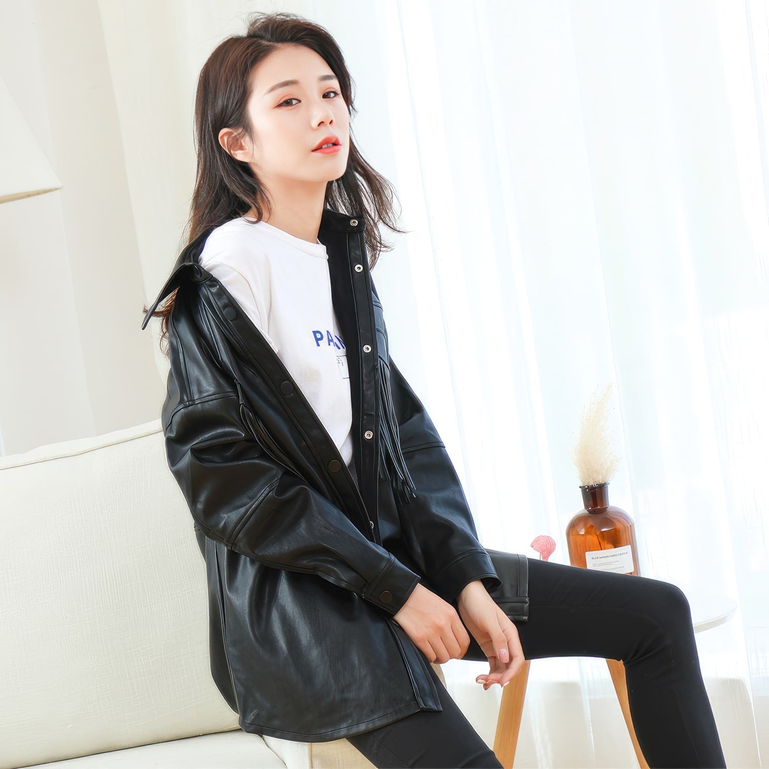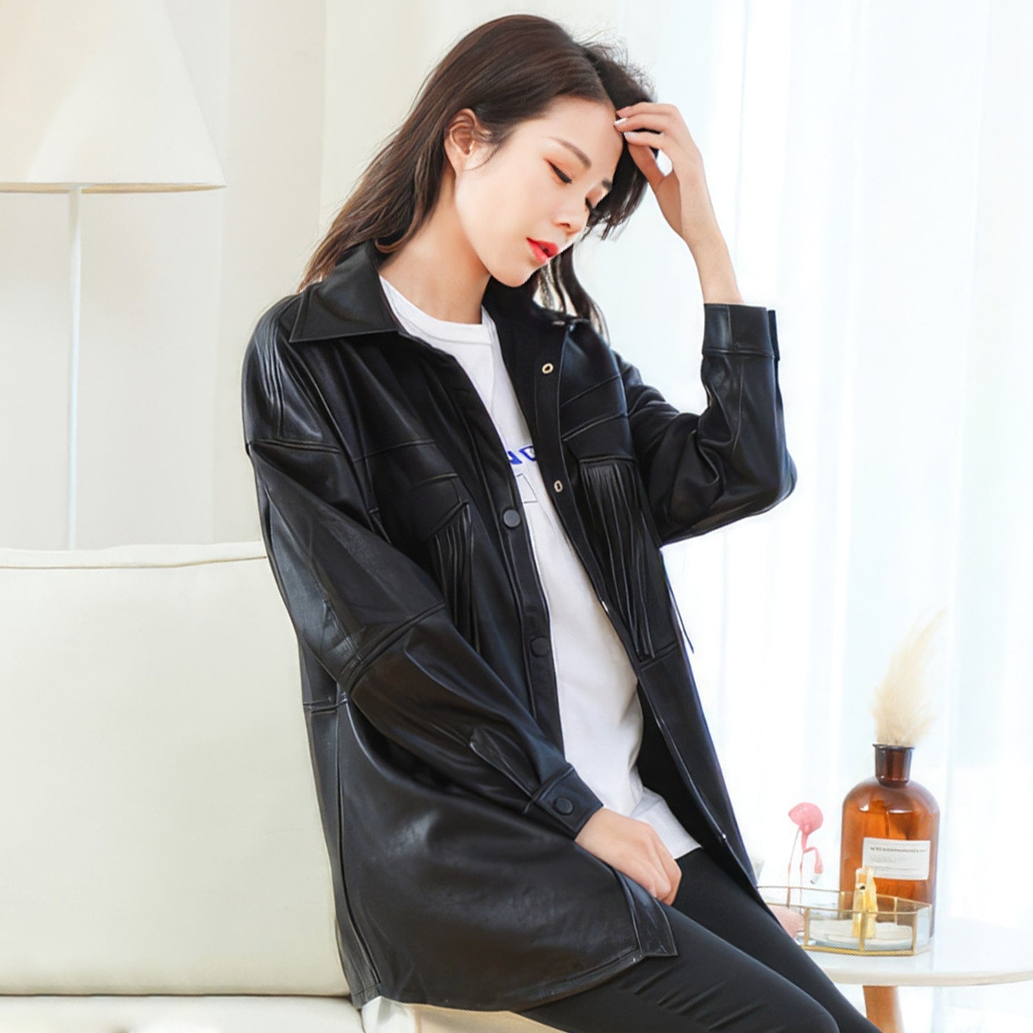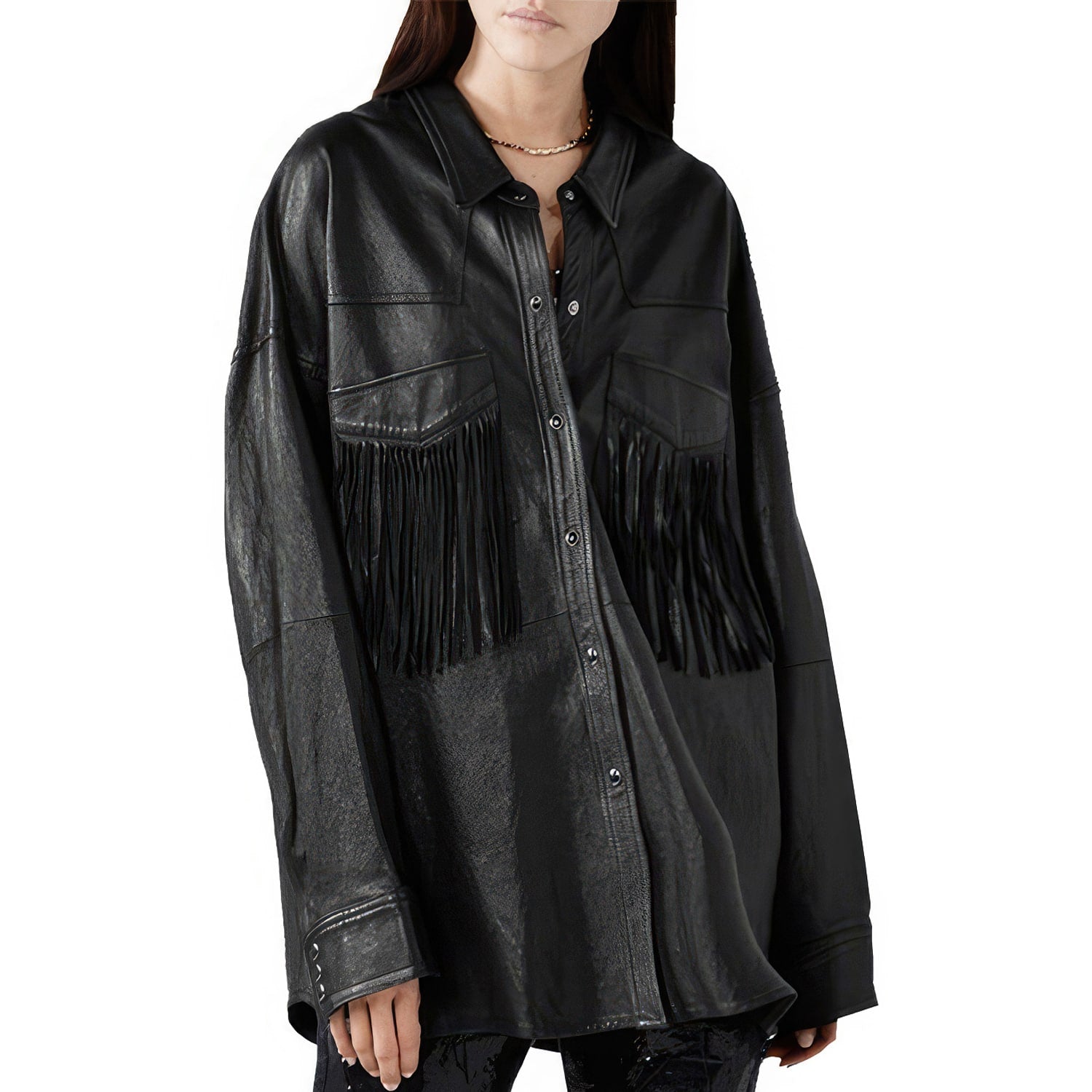 Women’s Black Genuine Sheepskin Pocket Tassels Motorcycle Biker Oversized Biker Racer Loose Fringed Leather Jacket