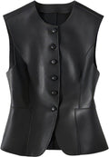 Women’s Black Genuine Sheepskin Round Neck 2 Pockets Smooth Sleeveless Waistcoat Single Breasted Casual Classic Leather Vest