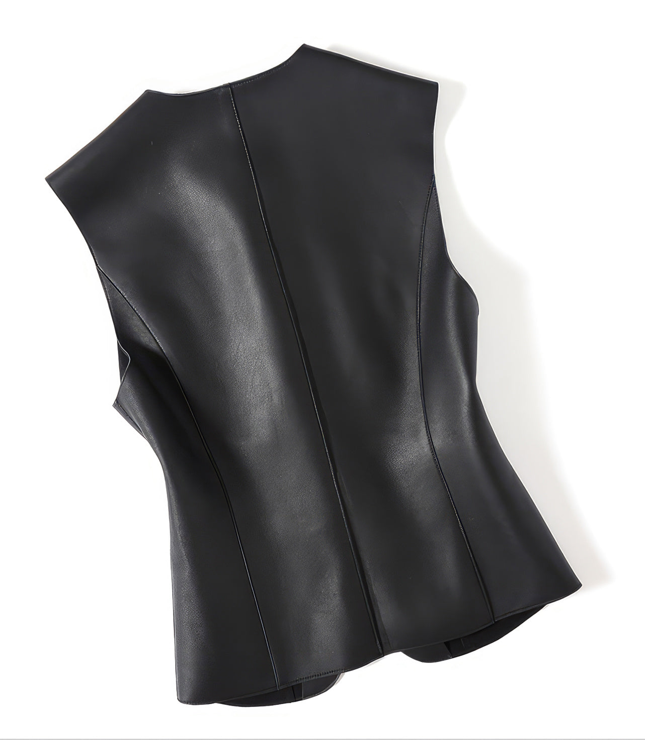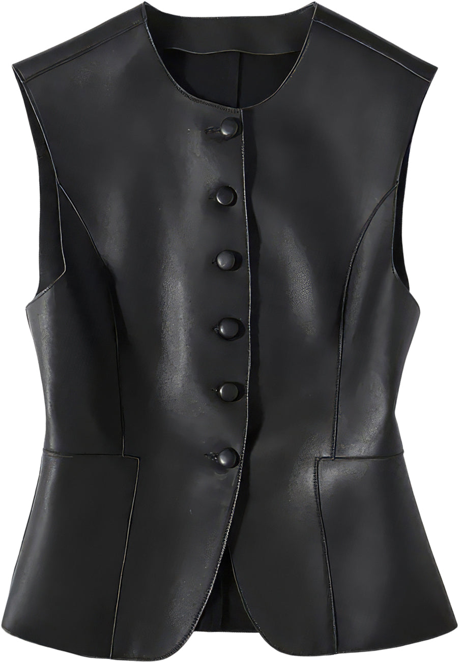 Dive into a blend of timeless design and superior craftsmanship with our Women’s Black Genuine Sheepskin Round Neck Sleeveless Leather Vest. Made from the finest sheepskin leather, it promises a tactile luxury and lasting durability. The classic round neck and single-breasted button closure exude an air of understated elegance, making it a versatile piece for a myriad of outfits. Designed sleeveless, it's perfect for layering, be it over a chic blouse or under a tailored jacket. Its smooth, classic finish ensures it stands out, yet seamlessly integrates with both casual and formal wardrobes. A testament to style and functionality, this vest is the quintessential addition for those who appreciate enduring fashion.